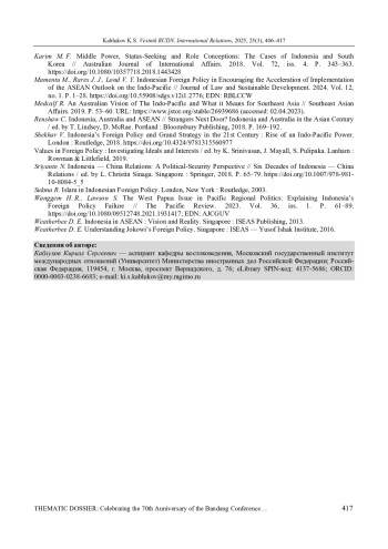 22. Karim M. F. Middle Power, Status-Seeking and Role Conceptions: The Cases of Indonesia and South Korea // Australian Journal of International Affairs. 2018. Vol. 72, iss. 4. P. 343-363. DOI: 10.1080/10357718.2018.1443428