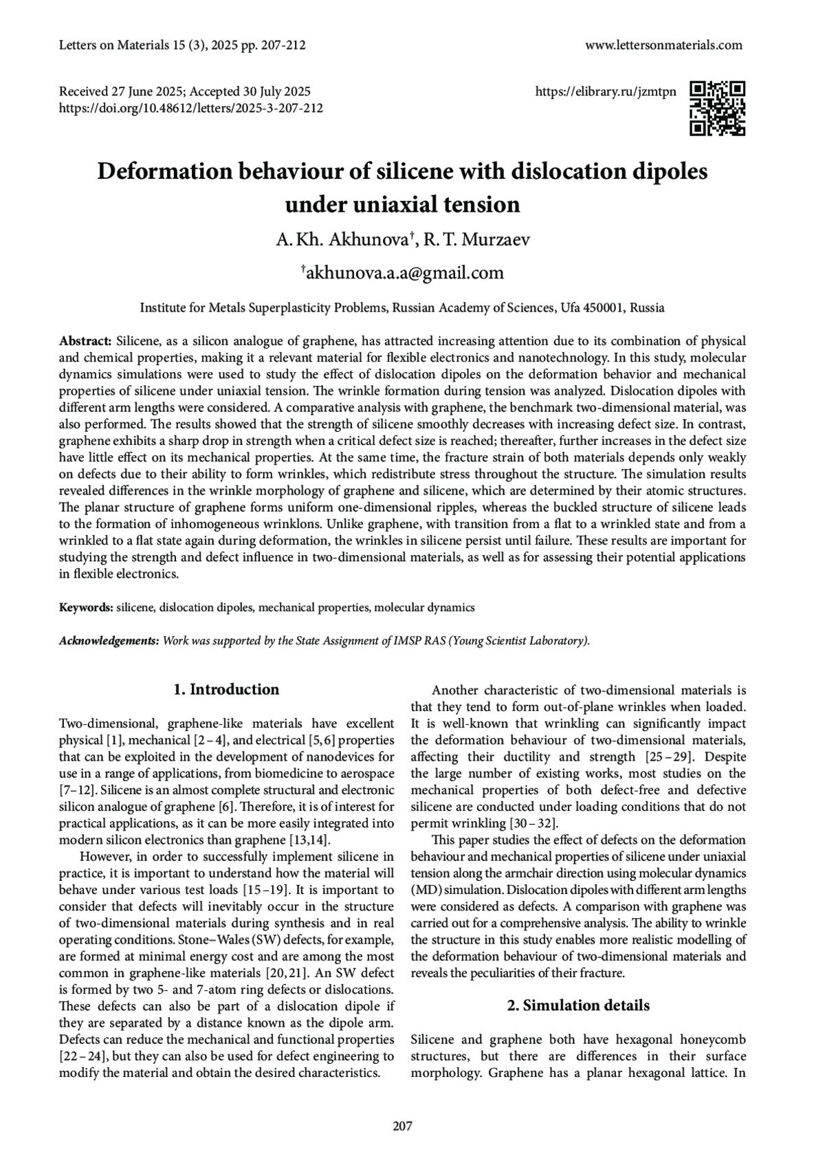 22. A. K. Akhunova, Y. A. Baimova, Effect of the Dislocation Dipoles with Different Arms on the Graphene Deformation Behavior: Molecular Dynamics. Technical Physics 69 (7) (2024) 1878 -1885. DOI: 10.1134/S1063784224070028