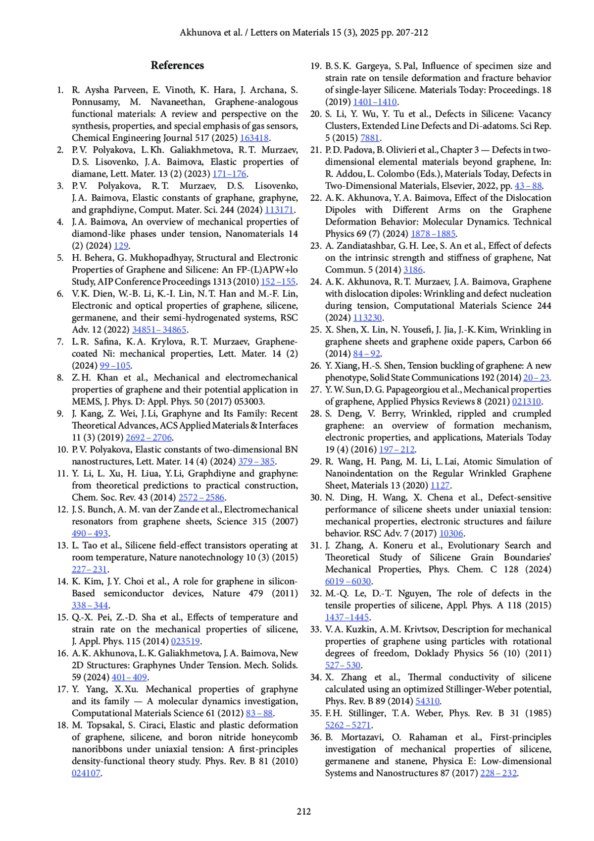 16. A. K. Akhunova, L. K. Galiakhmetova, J. A. Baimova, New 2D Structures: Graphynes Under Tension. Mech. Solids. 59 (2024) 401- 409. DOI: 10.1134/S0025654424602726