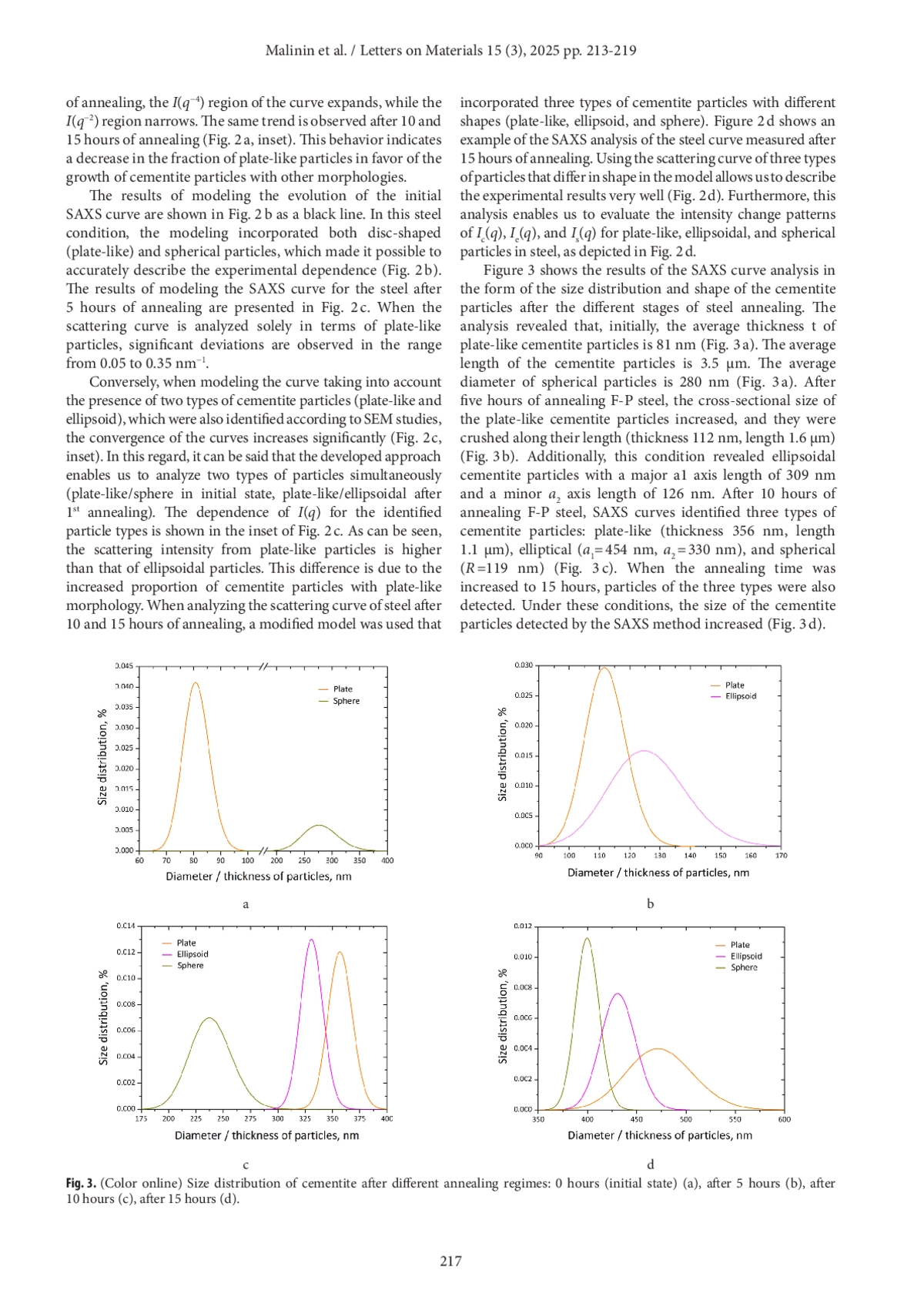 This paper presents a modified small-angle X-ray scattering (SAXS) method for analyzing the size and shape of hardening particles in steels. Unlike the conventional SAXS approach, which typically analyzes alloy particles of only one morphology, the modified method enables simultaneous evaluation of various types of particles differing in both size and morphology. The essence of the modification to SAXS method is that it takes into account the contribution of the intensity of the separate types of particles with different morphologies to the total true intensity. For each type of particles, shape and structural coefficients are set taking into account their spatial distribution in the analyzed area. To detect the presence of particles of different morphologies in alloys, the experimental patterns are analyzed. First, based on the I(q−n) dependence, the morphology of the existing types of particles was traditionally identified (cylinder / needle (n =1), plate / disk (n = 2), and ellipsoid / sphere (n = 3, 4)). Subsequently, individual regions of the SAXS curve were analyzed in the context of optimizing the size and shape of various particles. The modified SAXS method was tested for analyzing the morphology and size of cementite particles in ferrite-pearlite steel subjected to annealing. As a result, it was shown that during the annealing process of steel, cementite particle morphology in pearlite grains undergoes a stepwise transformation according to the following scheme: lamellar → ellipsoidal → spherical. For the first time, quantitative characteristics of the change in particle size distribution were obtained for different morphologies. The transformation of cementite particle morphology was found to be accompanied by growth, which leads to a decrease in the contribution of dispersion hardening.