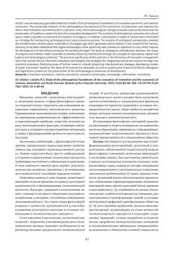Взаимосвязь инноваций и памяти проявляется в диалектике сохранения и изменения, единстве традиции и новации, взаимодополняемости прошлого и будущего и синтезе опыта и творчества [6, 14, 18]. Познание экономических процессов характеризуется комплексным подходом к изучению явлений, междисциплинарностью исследований, интеграцией различных типов знания и учетом социокультурного контекста [1, 2, 13, 17].