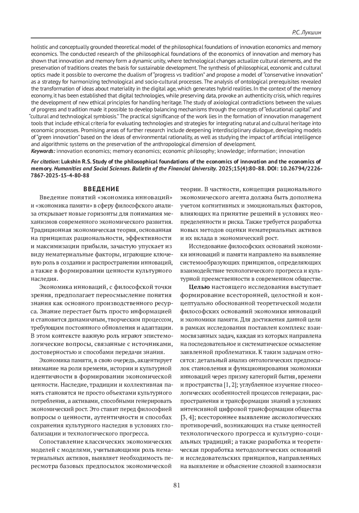 В статье рассматриваются философские основания экономики инноваций и экономики памяти. Анализируются ключевые понятия, определяющие специфику этих направлений экономической мысли, такие как знания, информация, творчество, время, наследие и идентичность. Определен понятийный аппарат экономики инноваций и экономики памяти, проведено исследование генезиса развития философии экономики инноваций и экономики памяти, и выявлены современные философские основания экономики инноваций и экономики памяти для достижения цели исследования — формирования всесторонней, целостной и концептуально обоснованной теоретической модели философских оснований экономики инноваций и экономики памяти. Проведенное исследование показало, что инновации и память образуют динамическое единство, где технологические изменения актуализируют культурные элементы, а сохранение традиций создает основу для устойчивого развития. Синтез философской, экономической и культурологической оптики позволил преодолеть дуализм «прогресс vs традиция» и предложить модель «консервативной инновации» как стратегию гармонизации технологических и социокультурных процессов. Анализ онтологических предпосылок выявил трансформацию представлений о материальности в цифровую эпоху, порождающую гибридные реальности. В контексте экономики памяти установлено, что цифровые технологии, сохраняя данные, провоцируют кризис аутентичности, что требует выработки новых этических принципов обращения с наследием. Исследование аксиологических противоречий между ценностями прогресса и традиции позволило разработать механизмы балансировки через концепции «образовательного капитала» и «культурно-технологического симбиоза». Практическая значимость работы заключается в формировании инструментов управления инновациями, учитывая этические критерии оценки технологий и стратегии интеграции природного и культурного наследия в экономические процессы. Перспективные направления дальнейших исследований включают углубление междисциплинарного диалога, разработку моделей «зеленых инноваций» на основе идей экологической рациональности, а также изучение влияния искусственного интеллекта и алгоритмических систем на сохранение антропологического измерения развития.