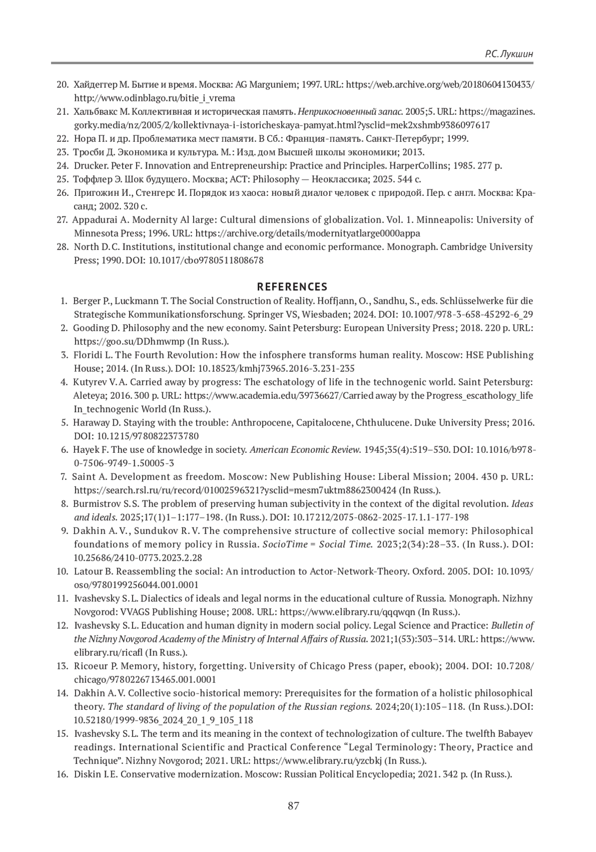20. Хальбвакс М. Коллективная и историческая память. Неприкосновенный запас. 2005;5. URL: https://magazines.gorky.media/nz/2005/2/kollektivnaya-i-istoricheskaya-pamyat.html?ysclid=mek2xshmb9386097617