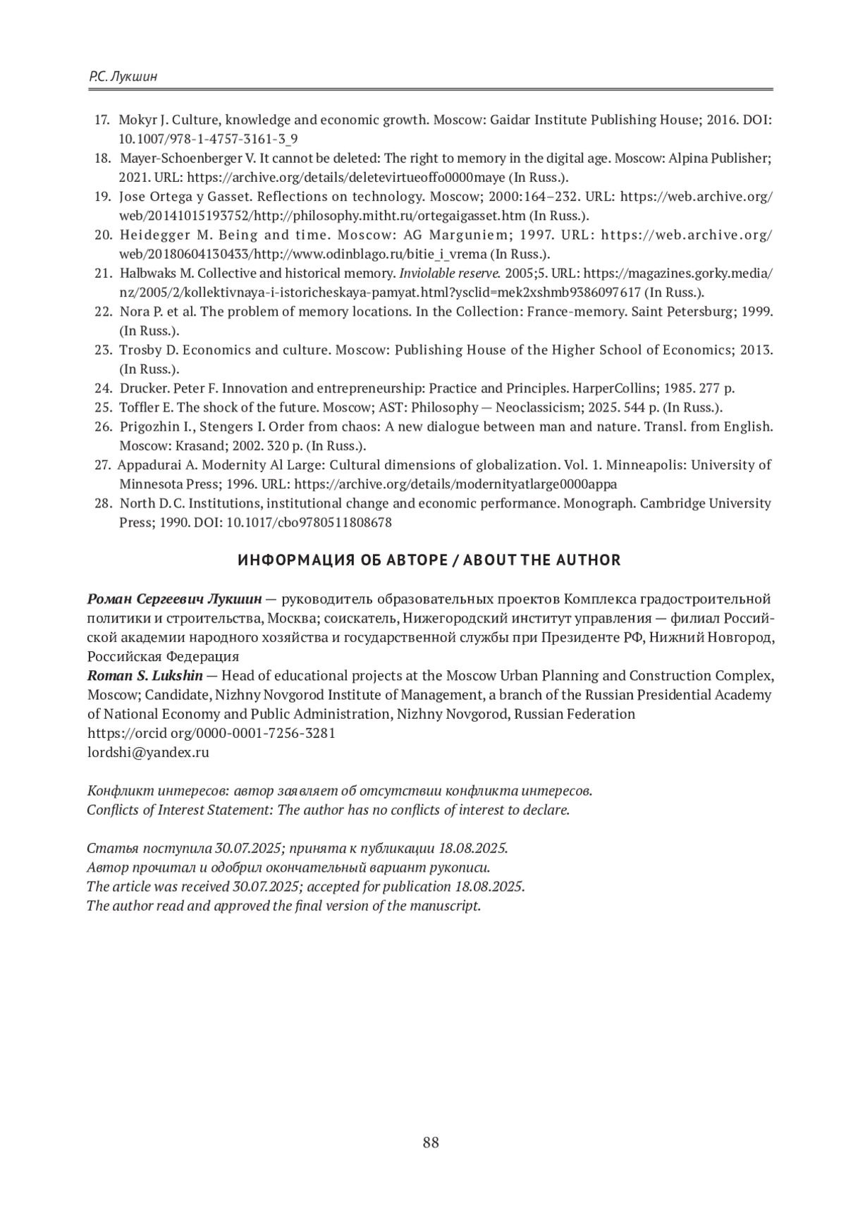 16. Дискин И. Е. Консервативная модернизация. Москва: Российская политическая энциклопедия; 2021. 342 с. 17. Mokyr J. Culture, knowledge and economic growth. Moscow: Gaidar Institute Publishing House; 2016. https://doi.org/10.1007/978-1-4757-3161-3_9