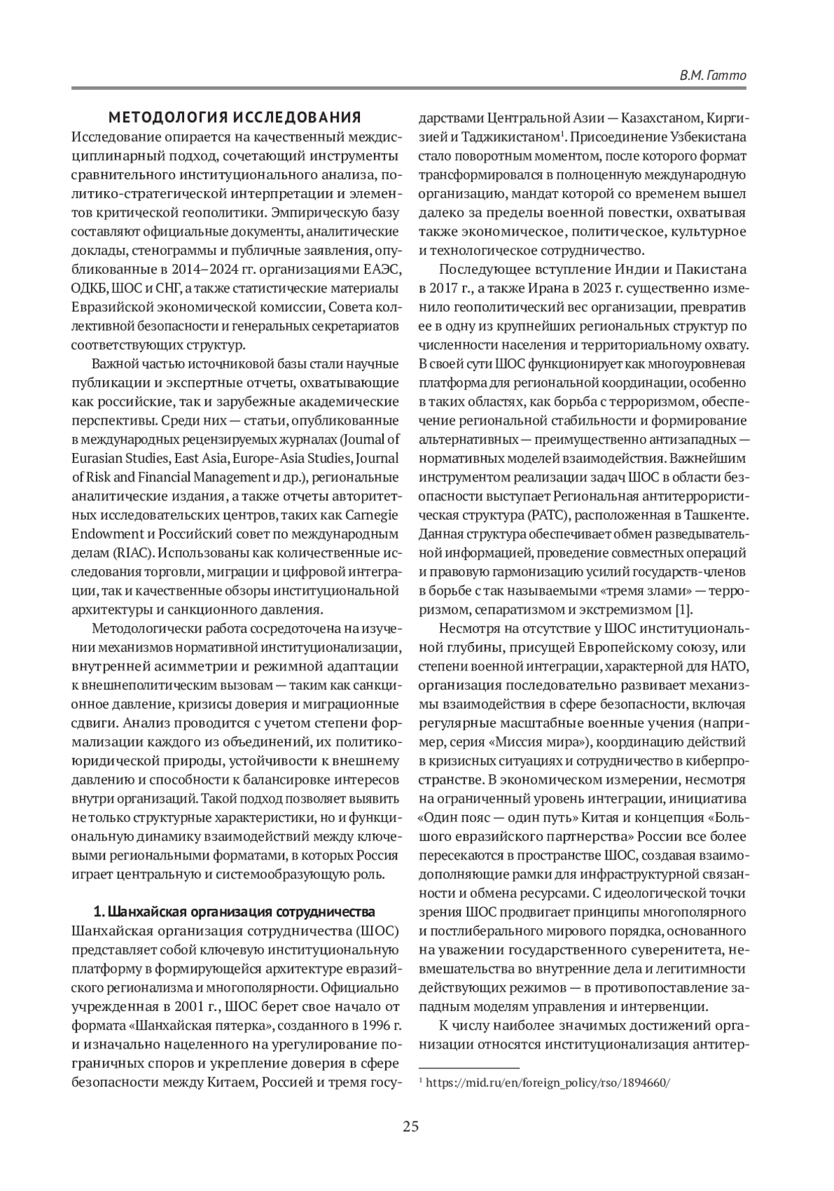 Статья посвящена исследованию институциональной стратегии России на евразийском пространстве через призму четырех ключевых региональных организаций: Евразийского экономического союза, Шанхайской организации сотрудничества, Организации Договора о коллективной безопасности и Содружества Независимых Государств. На фоне трансформации международного порядка, ослабления западных моделей глобального управления и перехода к многополярности Россия стремится закрепить свои интересы через институциональные механизмы, позволяющие формировать альтернативную архитектуру региональной координации. В работе предлагается комплексный политико-аналитический анализ логики, структуры и динамики указанных объединений как взаимосвязанных элементов внешнеполитической стратегии России. Показано, что Москва реализует многослойную модель, включающую формализованные механизмы (ОДКБ, ЕАЭС) и гибкие форматы (ШОС, СНГ), адаптированные под разные направления и уровни интеграции. Отдельное внимание уделено сравнительному анализу роли России, Китая и Индии, а также внутренним противоречиям в институциональной практике — от разницы в правовых режимах до символической политики регионального лидерства. Новизна исследования заключается в интерпретации региональных организаций не как изолированных институтов, а как функционально связанных компонентов целостной стратегии построения постзападного порядка. В статье рассматриваются механизмы валютной и трудовой интеграции, последствия санкционного давления, логика безопасности и принципы политического балансирования. Сделан вывод о том, что Россия конструирует не централизованный блок, а сеть режимов, объединенных общей нормативной платформой, в рамках которой утверждаются принципы суверенитета, невмешательства и стратегической автономии. Эти структуры выступают аренами проекции влияния, легитимации альтернативных норм и управления противоречиями в условиях глобальной турбулентности.