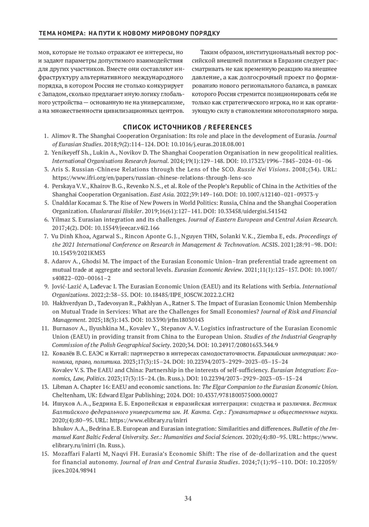 1. Alimov R. The Shanghai Cooperation Organisation: Its role and place in the development of Eurasia. Journal of Eurasian Studies. 2018;9(2):114-124. https://doi.org/10.1016/j.euras.2018.08.001
