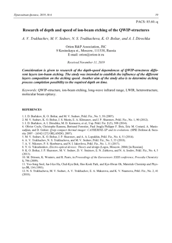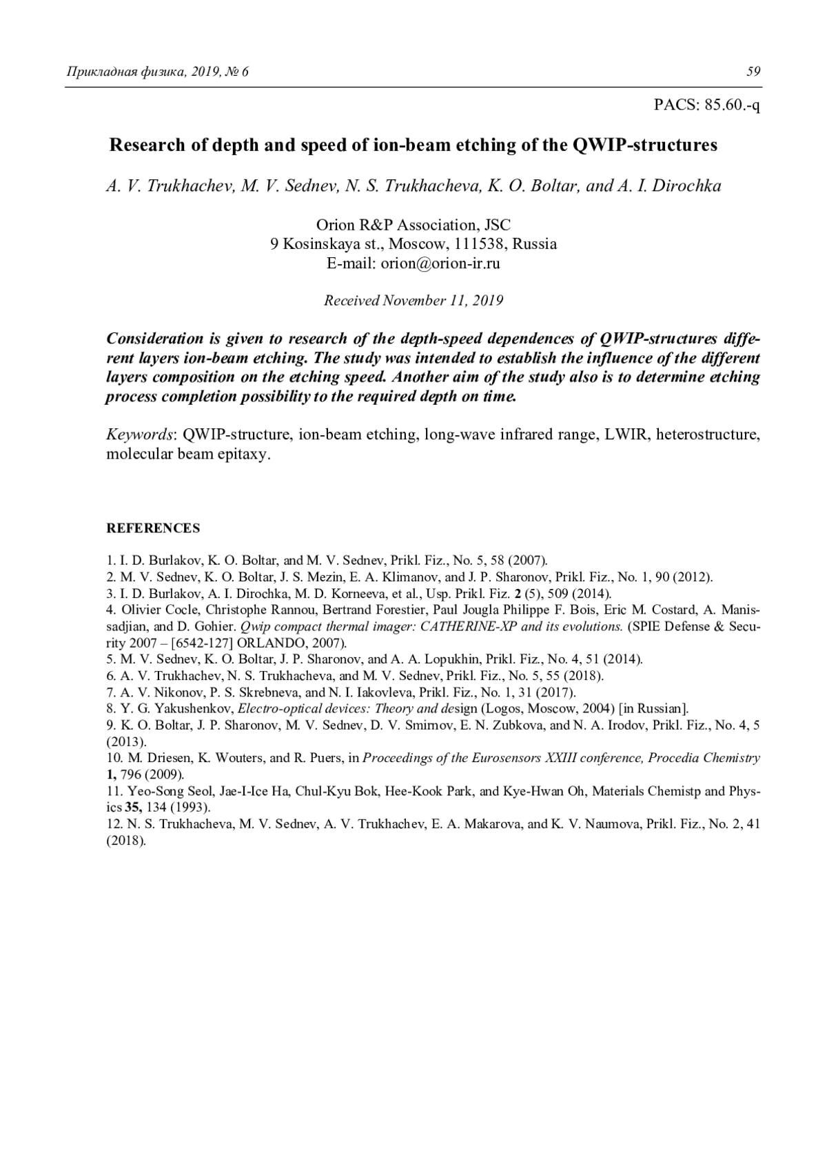 A. V. Trukhachev, M. V. Sednev, N. S. Trukhacheva, K. O. Boltar, and A. I. Dirochka Research of depth and speed of ion-beam etching of the QWIP-structures 54