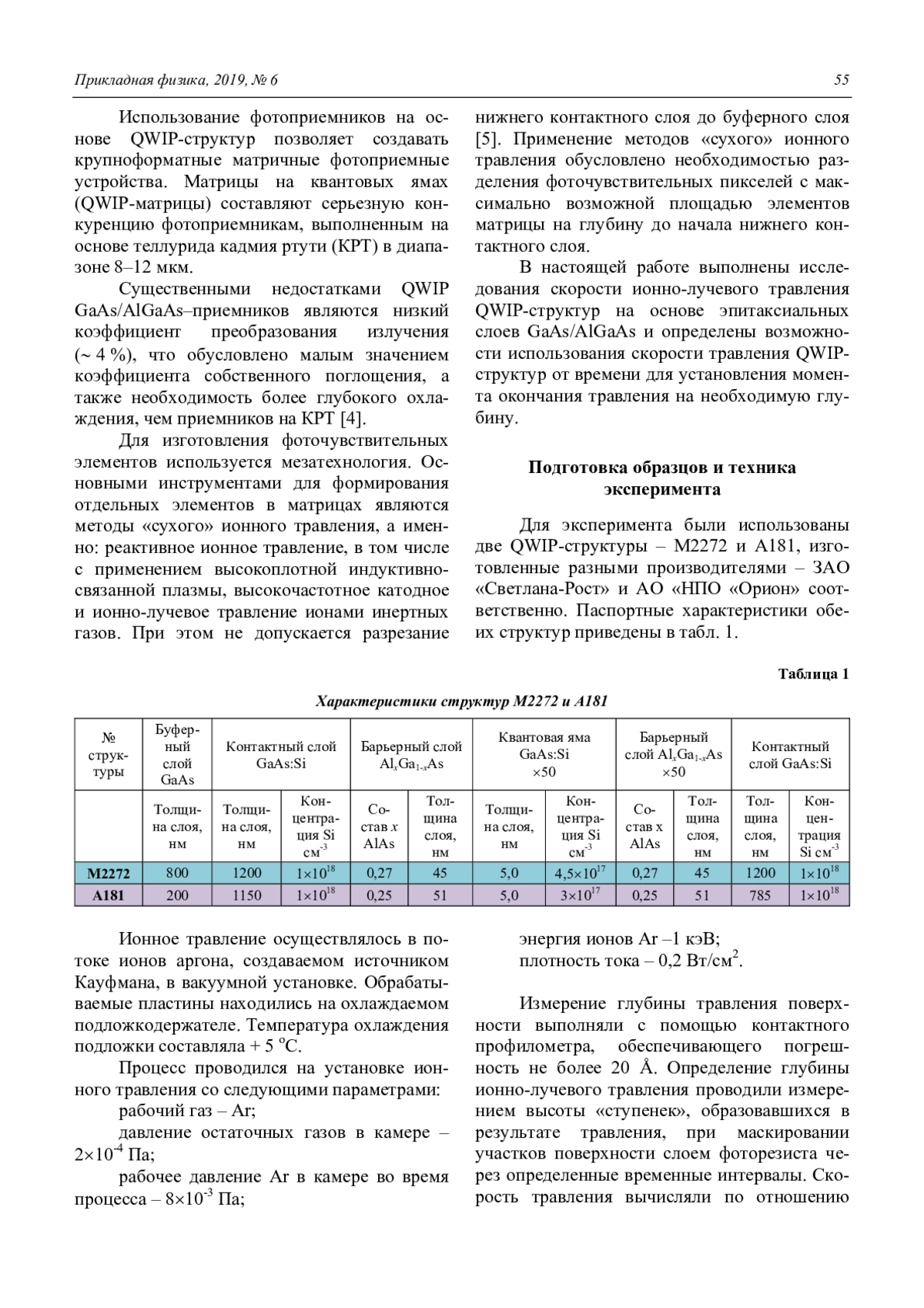 В работе исследованы зависимости скорости ионно-лучевого травления по глубине QWIP-структур, а также влияние состава гетероэпитаксиальных слоев на скорость травления.