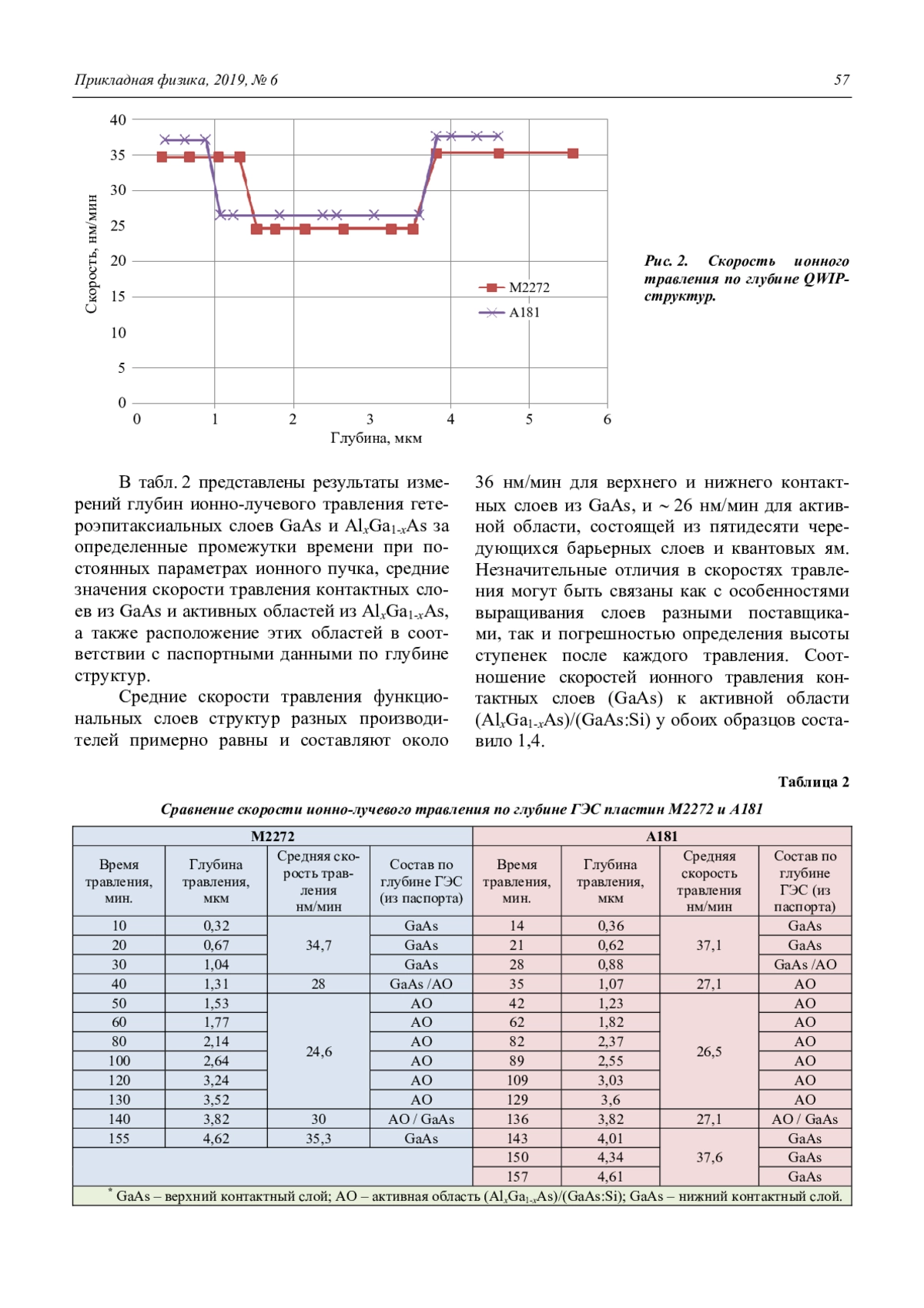 Из полученных экспериментальных результатов следует, что скорости процесса ионного травления для QWIP-структур разных производителей близки. Это делает возможным определение завершения процесса травления на необходимую глубину по времени травления. Также продемонстрировано влияние состава гетероэпитаксиальных слоев на скорость травления: более высокая скорость травления верхнего и нижнего контактных слоев по сравнению с меньшей скоростью травления активной области.