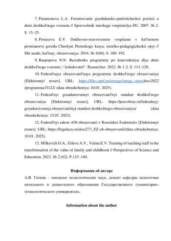 13. Milkevich O.A., Gileva A.V., Vatina E.V. Training of teaching staff in the transformation of the value of family and childhood // Perspectives of Science and Education. 2023. № 2 (62). P. 125-140.