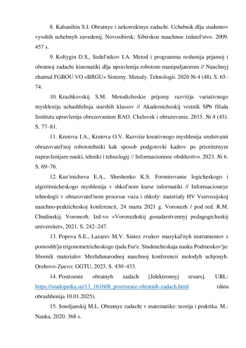 11. Крутова И.А., Крутова О.В. Развитие креативного мышления средствами образовательной робототехники как способ подготовки кадров по приоритетным направлениям науки, техники и технологий // Информационное общество. 2023. № 6. С. 69-76. EDN: HEOAQH