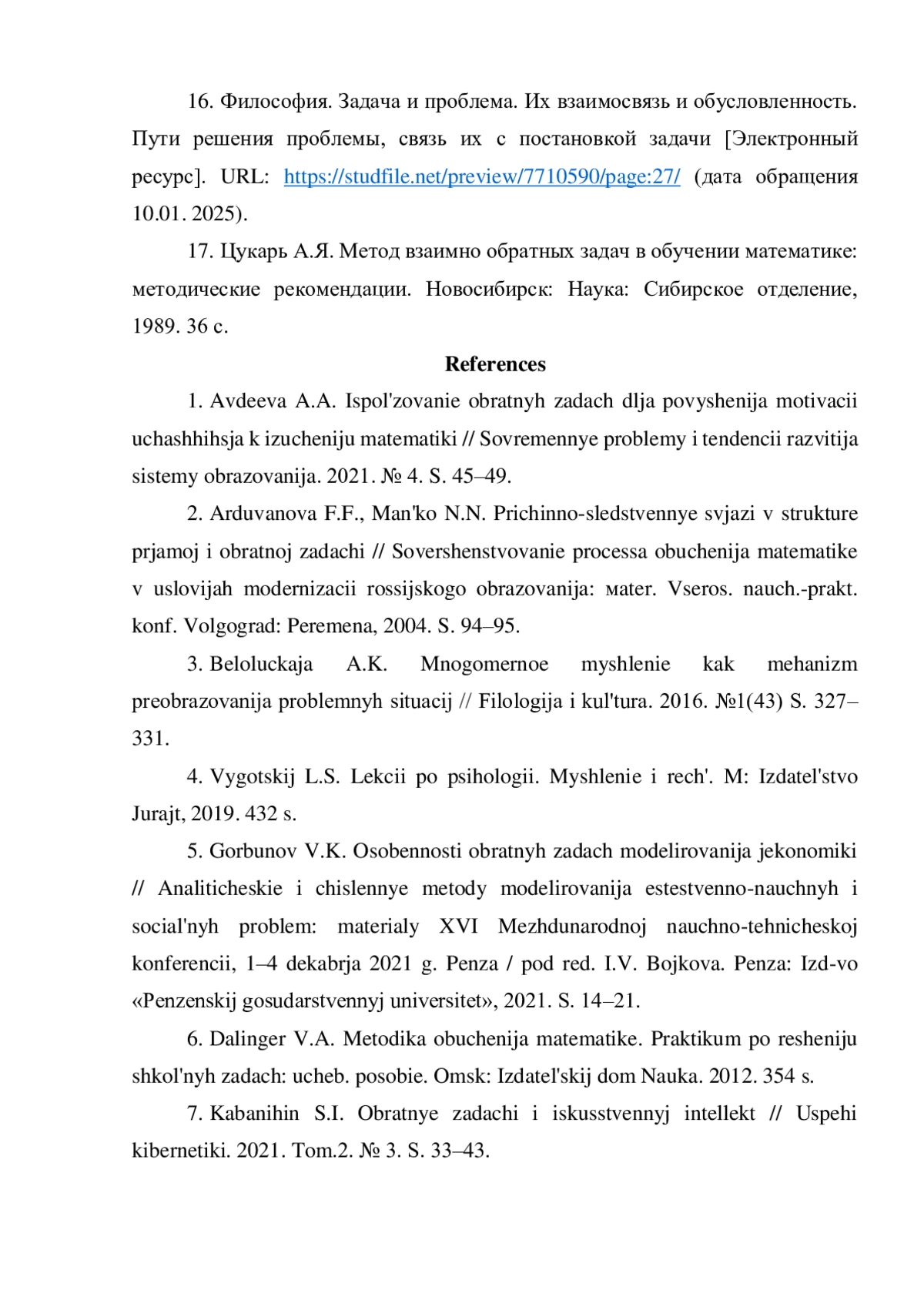 2. Ардуванова Ф.Ф., Манько Н.Н. Причинно-следственные связи в структуре прямой и обратной задачи // Совершенствование процесса обучения математике в условиях модернизации российского образования: материалы Всерос. науч.-практ. конф. Волгоград: Перемена, 2004. С. 94-95. EDN: UYIJJJ