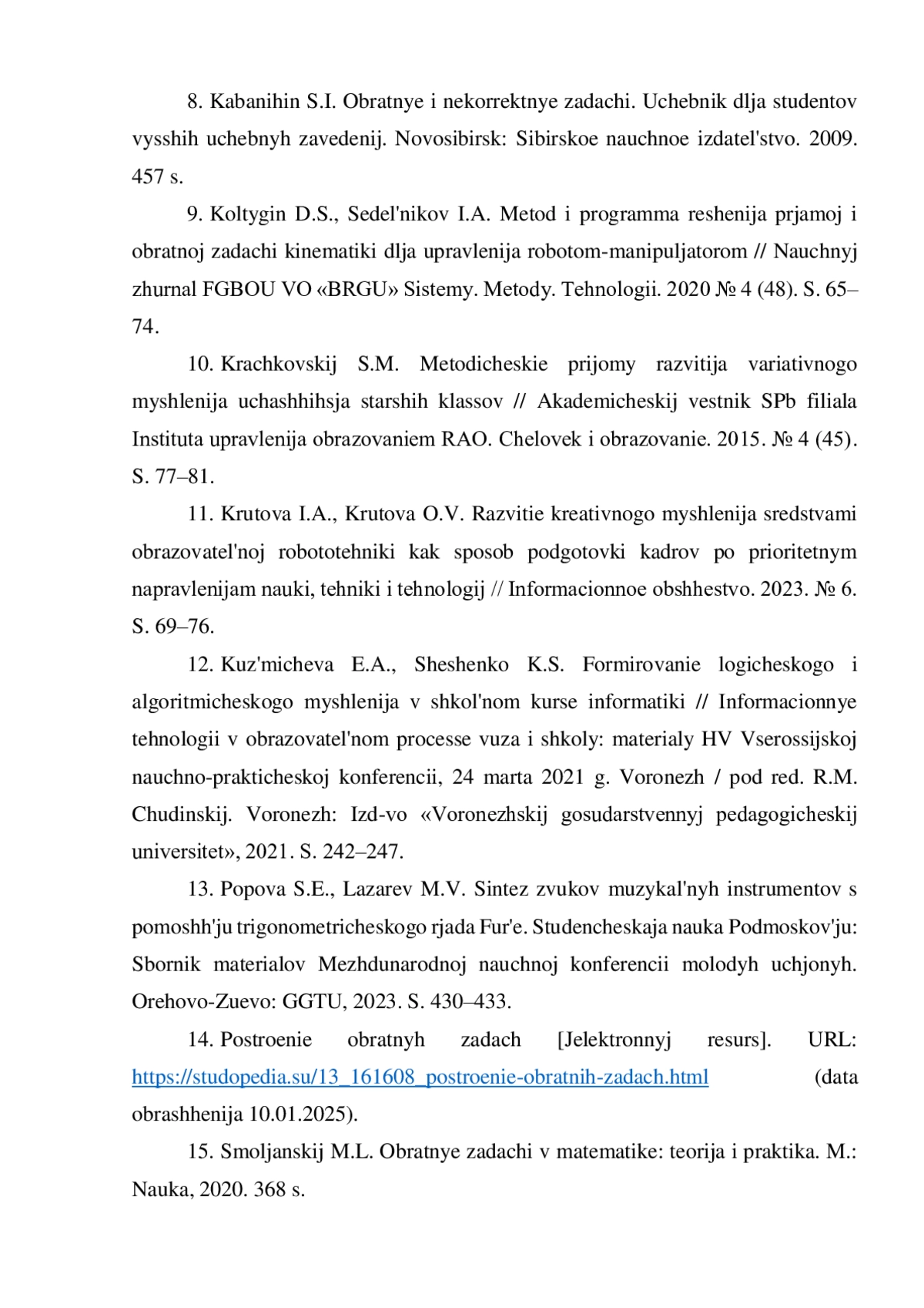 9. Колтыгин Д.С., Седельников И.А. Метод и программа решения прямой и обратной задачи кинематики для управления роботом-манипулятором // Научный журнал ФГБОУ ВО “БРГУ” Системы. Методы. Технологии. 2020 № 4 (48). С. 65-74.