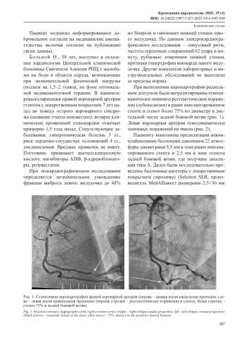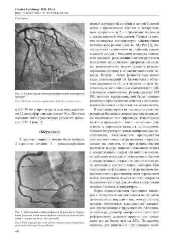 На примере данного клинического случая проанализированы основные особенности применения баллонов с лекарственным покрытием у больных с хронической ишемической болезнью сердца и стенозирующим поражением коронарного русла. Представлена альтернатива рутинной клинической практике реваскуляризации коронарных артерий с применением стентов с лекарственным покрытием в виде ангиопластики с использованием баллонов с лекарственным покрытием. В настоящее время данная технология имеет убедительную доказательную базу в лечении пациентов с внутристентовыми рестенозами, а также в артериях малого диаметра, однако может также применяться при стенотических поражениях в непосредственной близости от мышечного мостика, при невозможности проведения стента с лекарственным покрытием, при отказе пациента от имплантации стента, что позволит минимизировать количество процедур имплантации стентов в коронарные артерии и увеличить физиологичность выполняемых вмешательств, улучшить отдаленные результаты интервенций.