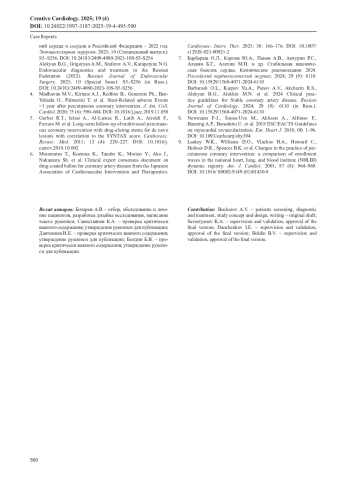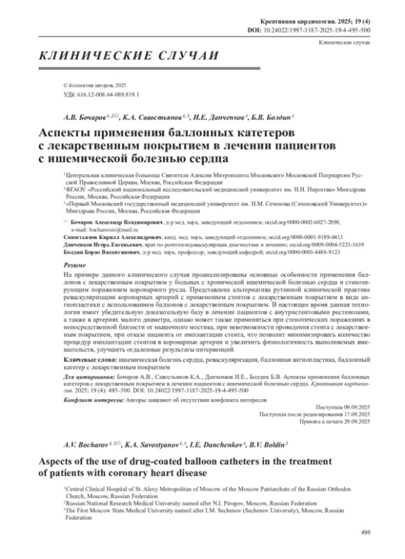 БОЧАРОВ А. В., САВОСТЬЯНОВ К. А., ДАНЧЕНКОВ И. Е., БОЛДИН Б. В. АСПЕКТЫ ПРИМЕНЕНИЯ БАЛЛОННЫХ КАТЕТЕРОВ С ЛЕКАРСТВЕННЫМ ПОКРЫТИЕМ В ЛЕЧЕНИИ ПАЦИЕНТОВ С ИШЕМИЧЕСКОЙ БОЛЕЗНЬЮ СЕРДЦА // КРЕАТИВНАЯ КАРДИОЛОГИЯ. 2025. № 4, ТОМ 19