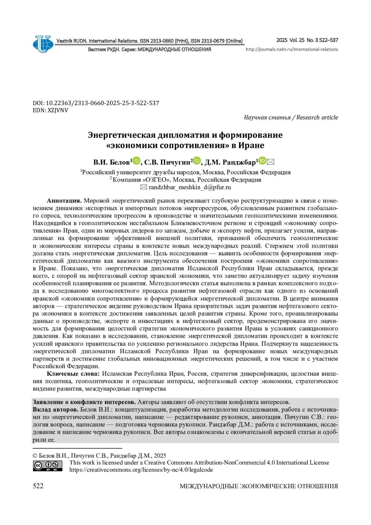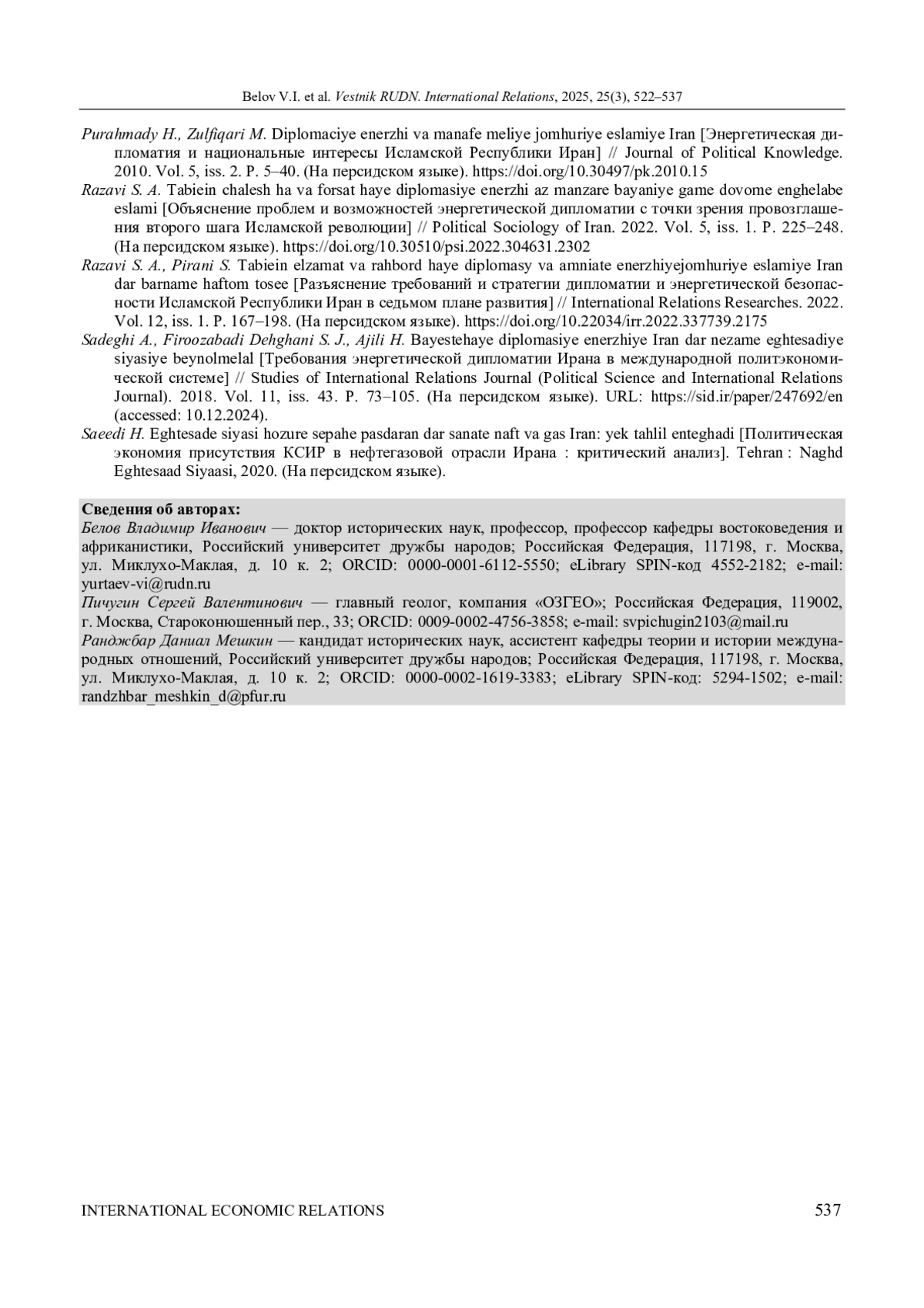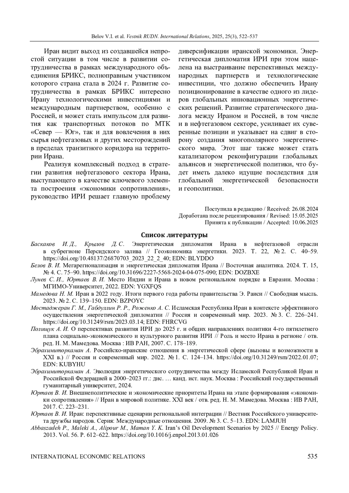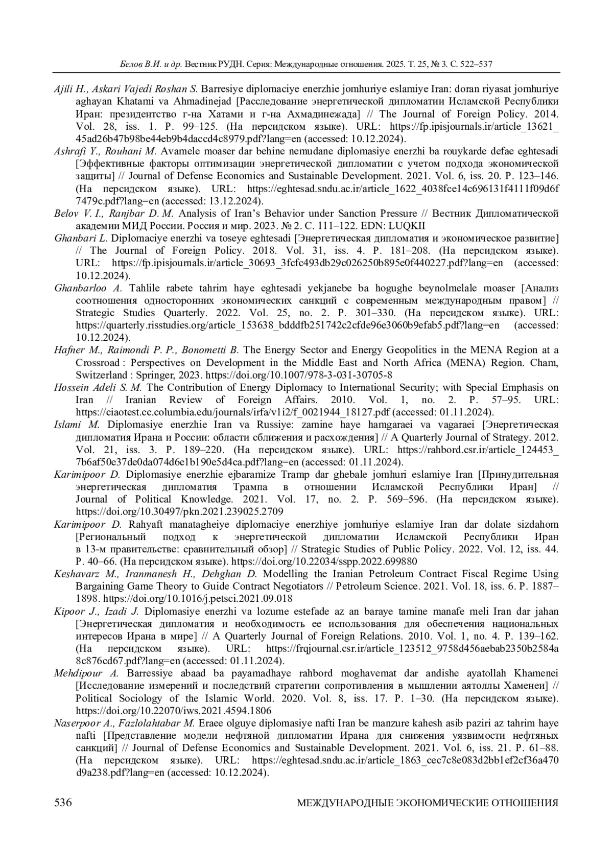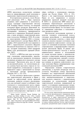 2. Белов В. И. Мегарегионализация и энергетическая дипломатия Ирана // Восточная аналитика. 2024. Т. 15, № 4. С. 75-90. ;. DOI: 10.31696/2227-5568-2024-04-075-090 EDN: DOZBXE