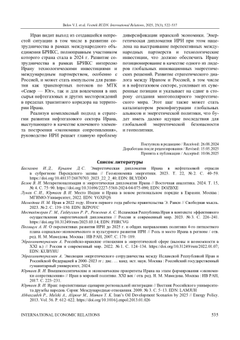 1. Баскаков И. Д., Крылов Д. С. Энергетическая дипломатия Ирана в нефтегазовой отрасли в субрегионе Персидского залива // Геоэкономика энергетики. 2023. Т. 22, № 2. С. 40-59. ;. DOI: 10.48137/26870703_2023_22_2_40 EDN: BLYDDO