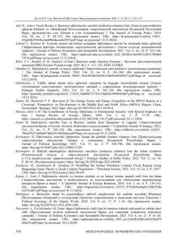 25. Naserpoor A., Fazlolahtabar M. Eraee olguye diplomasiye nafti Iran be manzure kahesh asib paziri az tahrim haye nafti [Представление модели нефтяной дипломатии Ирана для снижения уязвимости нефтяных санкций] // Journal of Defense Economics and Sustainable Development. 2021. Vol. 6, iss. 21. P. 61-88. (На персидском языке). URL: https://eghtesad.sndu.ac.ir/article_1863_cec7c8e083d2bb1ef2cf36a470d9a238.pdf?lang=en (accessed: 10.12.2024).