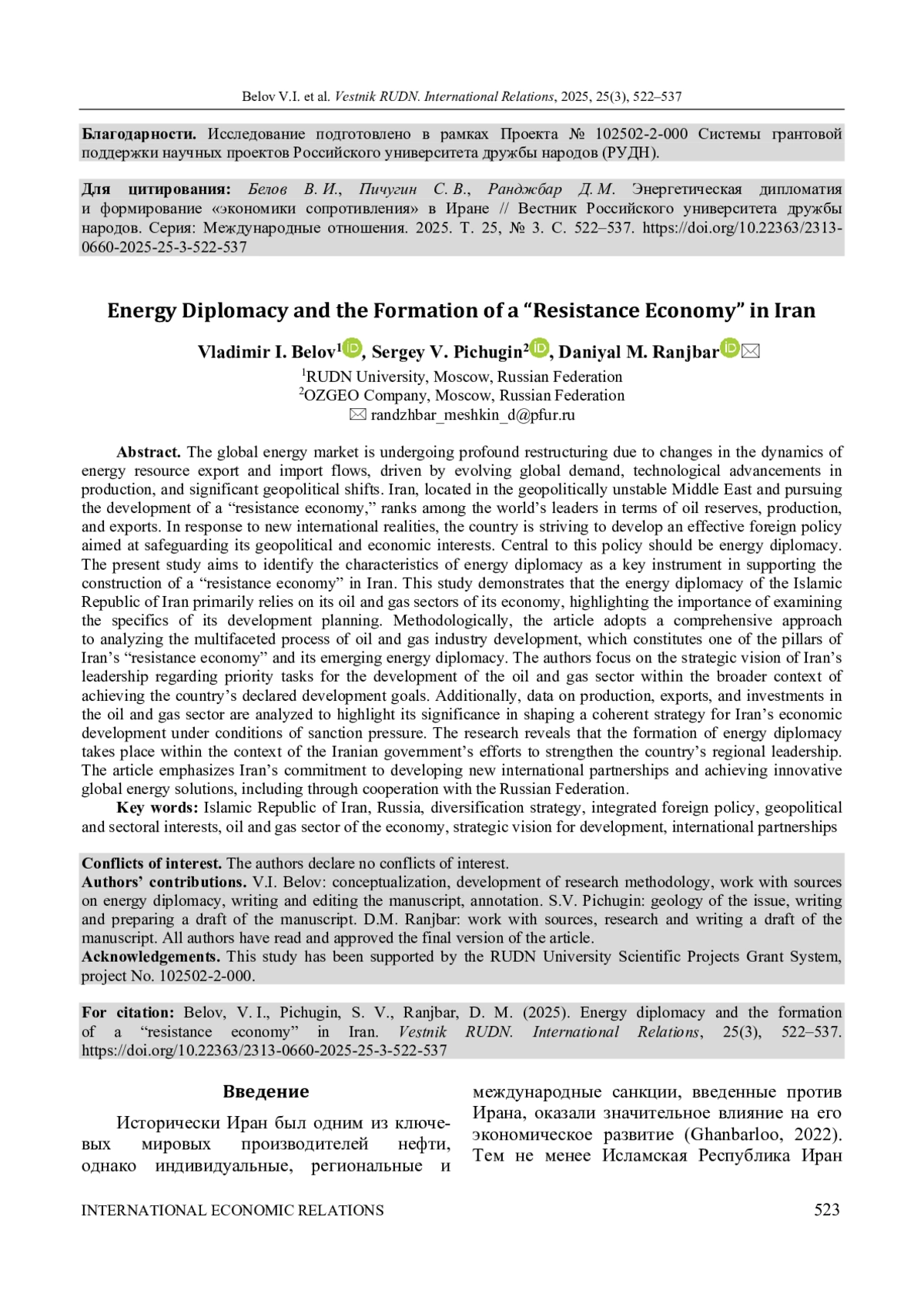 14. Belov V. I., Ranjbar D. M. Analysis of Iran’s Behavior under Sanction Pressure // Вестник Дипломатической академии МИД России. Россия и мир. 2023. № 2. С. 111-122. EDN: LUQKII