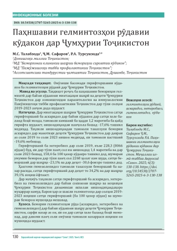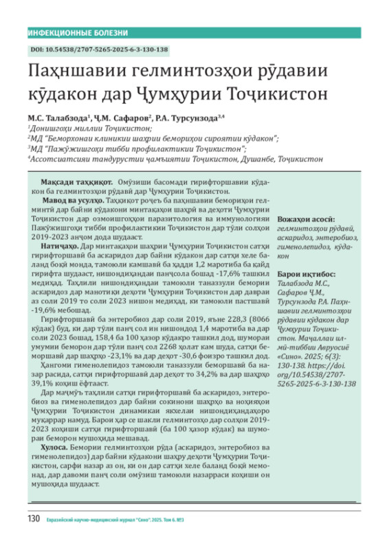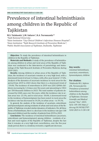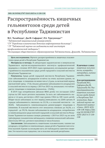 Заключение. Заболеваемость кишечными гельминтозами, такими как аскаридоз, энтеробиоз и гименолепидоз, среди детей в Таджикистане оста- ётся высокой. Однако за последние пять лет наблюдается заметное снижение. Это касается как городских, так и сельских жителей республики.