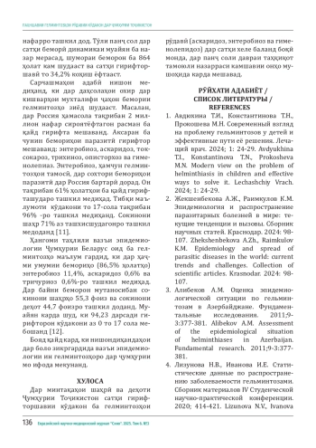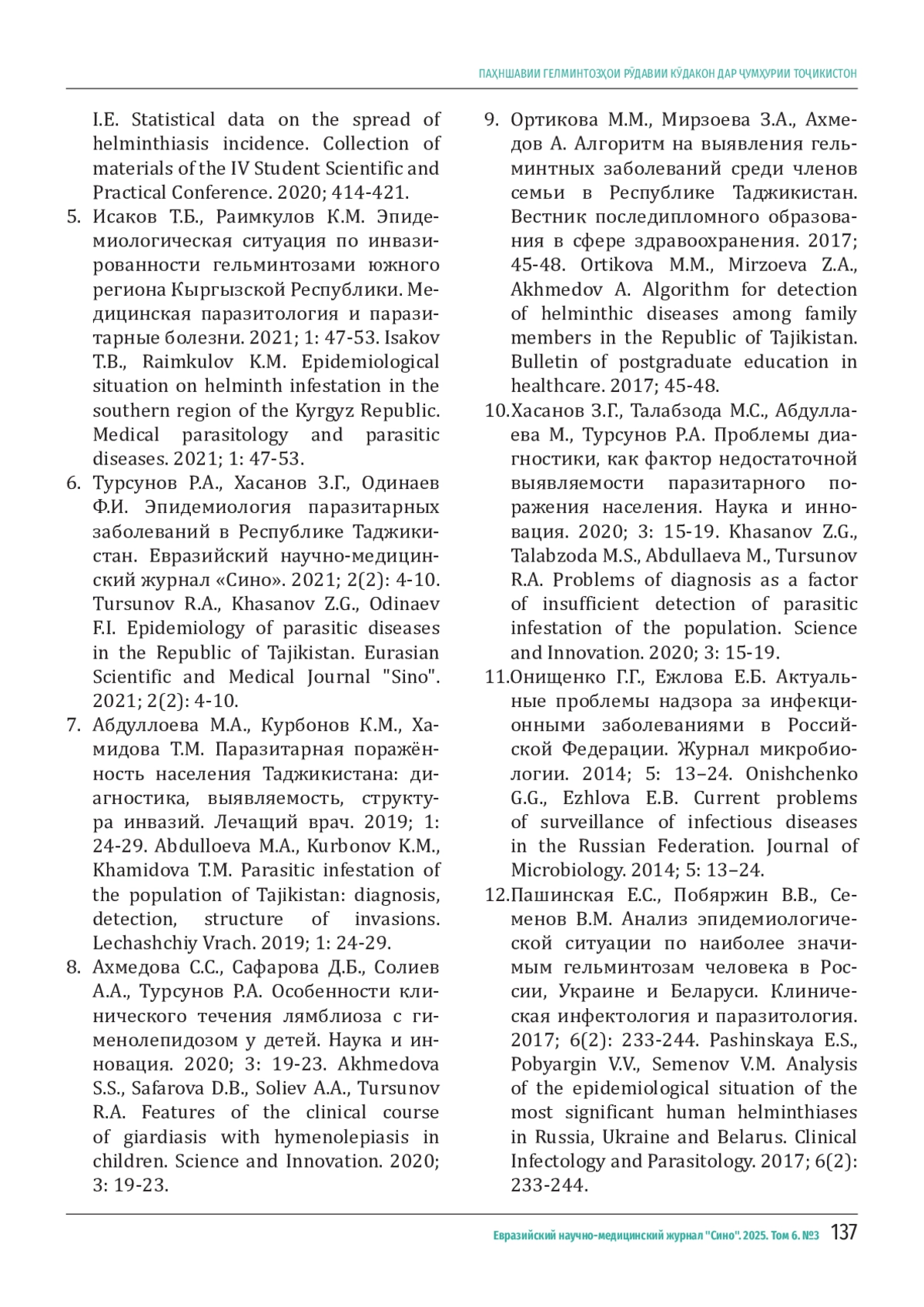10. Хасанов З.Г., Талабзода М.С., Абдуллаева М., Турсунов Р.А. Проблемы диагностики, как фактор недостаточной выявляемости паразитарного поражения населения. Наука и инновация. 2020; 3: 15-19.