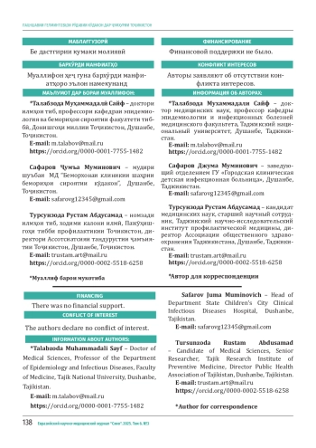 8. Ахмедова С.С., Сафарова Д.Б., Солиев А.А., Турсунов Р.А. Особенности клинического течения лямблиоза с гименолепидозом у детей. Наука и инновация. 2020; 3: 19-23.