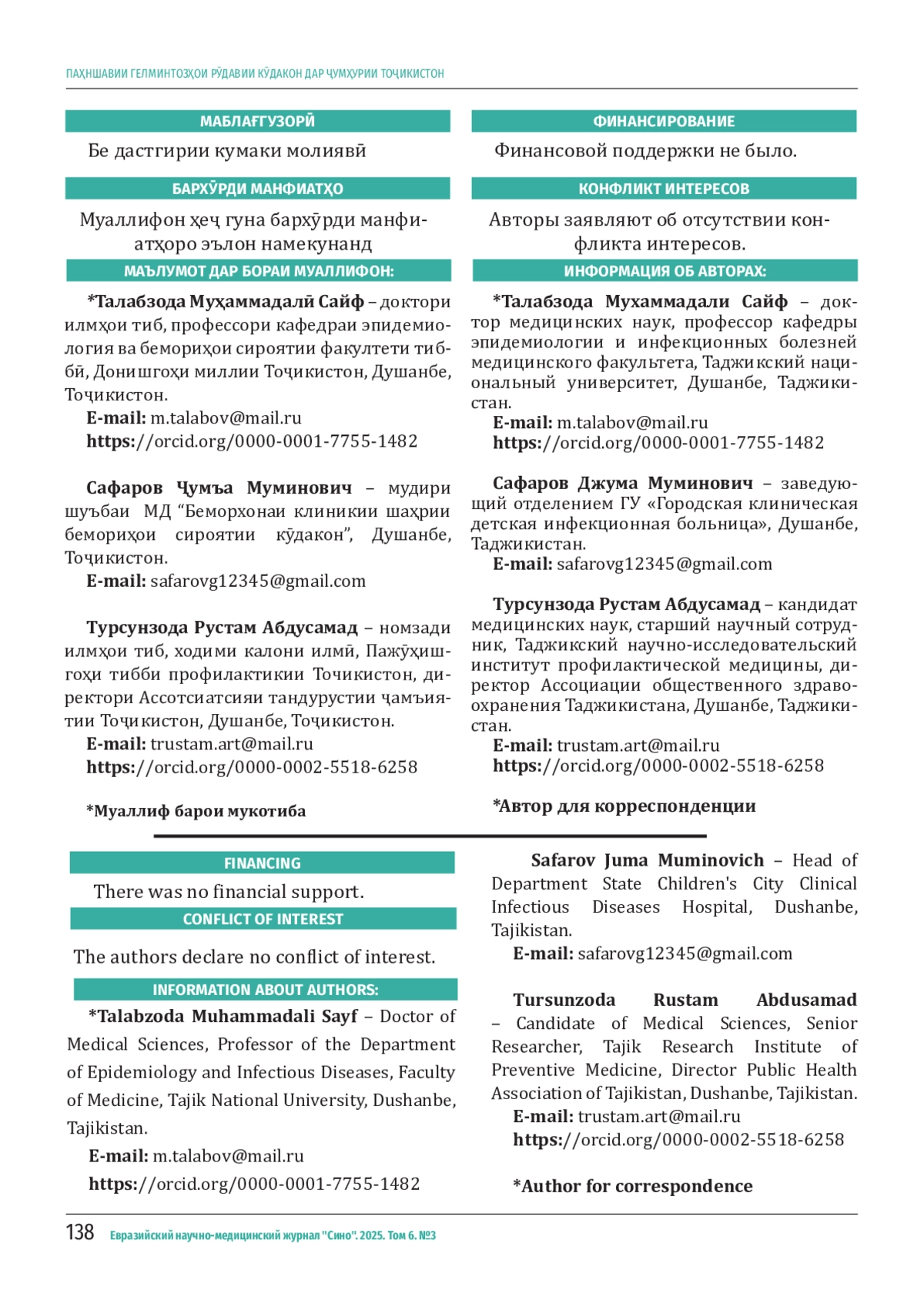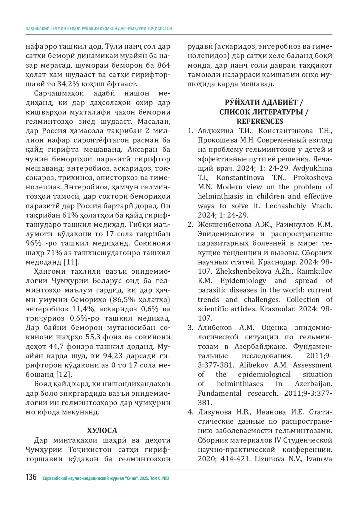 6. Турсунов Р.А., Хасанов З.Г., Одинаев Ф.И. Эпидемиология паразитарных заболеваний в Республике Таджикистан. Евразийский научно-медицинский журнал “Сино”. 2021; 2(2): 4-10.