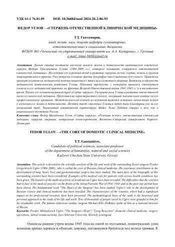 Данная статья посвящена научному анализу жизни и деятельности выдающегося советского хирурга Федора Григорьевича Углова (1904-2008 гг.), которого называют «стержнем отечественной клинической медицины». Исследован его огромный вклад в развитие хирургии легких, сердца, печени и органов пищеварительного тракта. Рассмотрены основные факты биографии этого выдающегося ученого. Приведены примеры оказания им медицинской помощи пациентам с тяжелым состоянием здоровья. Выявлены особенности медицинской деятельности академика Углова. Показаны трудности, с которыми пришлось столкнуться ученому в его медицинской практике на фронтах Великой Отечественной войны 1941-1945 гг. и в послевоенное время. Изучен его основополагающий труд «Сердце хирурга». Раскрыта роль Углова в развитии отечественной науки и клинической медицины. Представлена характеристика ученого, оказавшая значительное влияние на его профессиональное призвание. Методологической основой исследования является историко-личностный подход к изучению его жизни и деятельности. Десятки тысяч спасенных Угловым людей были благодарны ему за его неоценимый труд. Знаменитый американский кардиохирург Майкл Эллис Дебейки говорил о нем, как о национальном достоянии России.