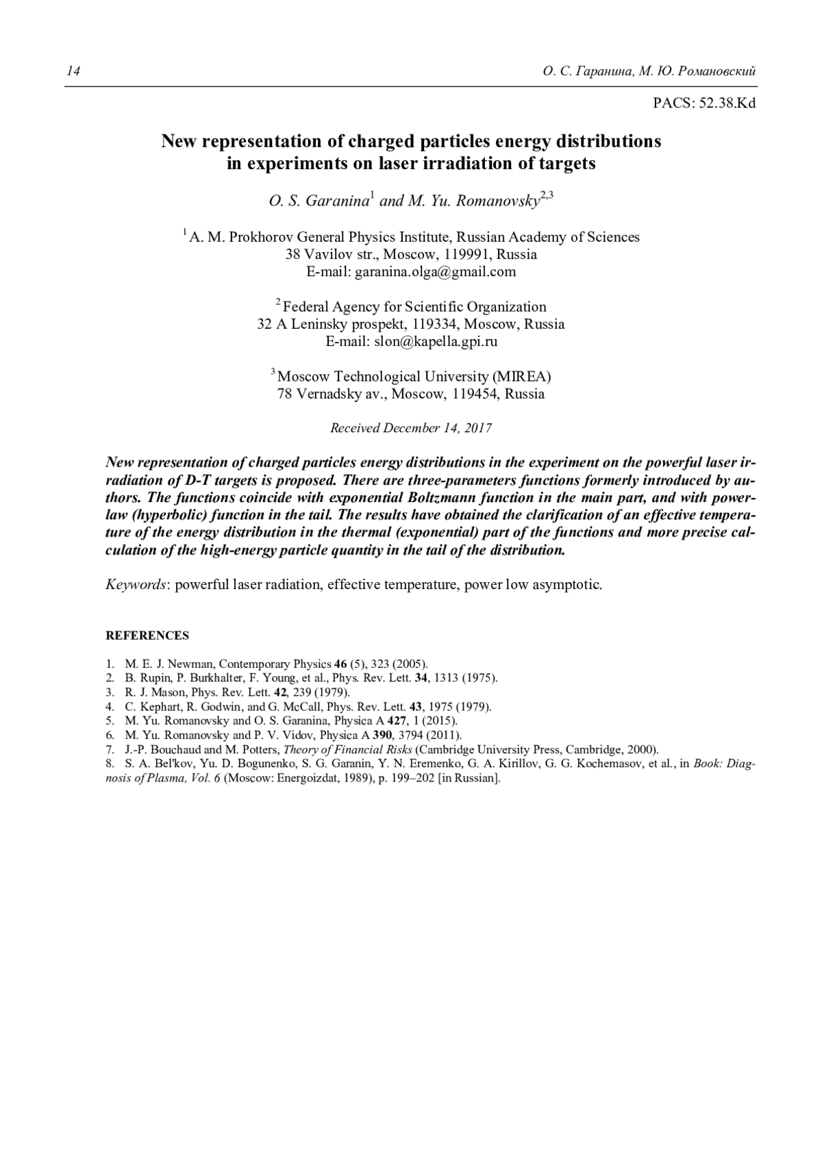 Гаранина О. С., Романовский М. Ю. Анализ распределения по энергии заряженных частиц в экспериментах по лазерному облучению мишеней 11