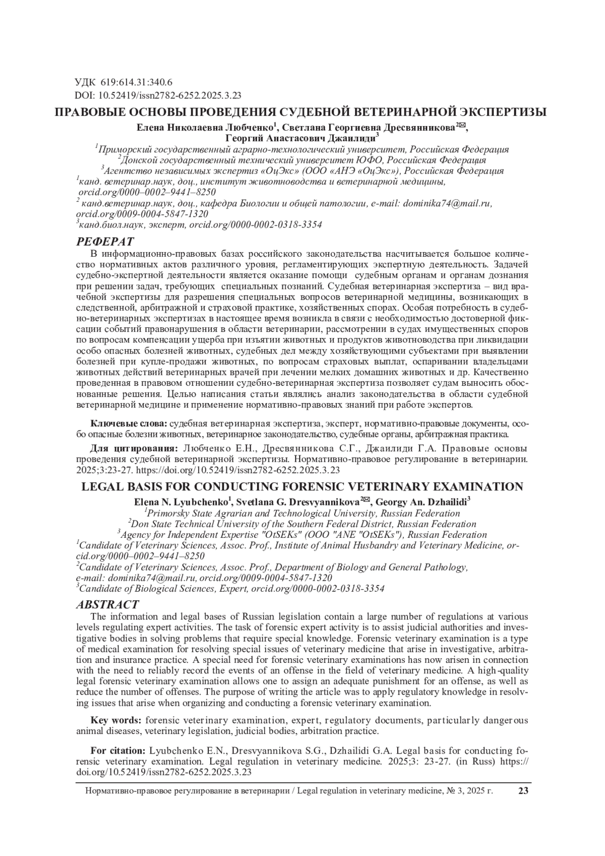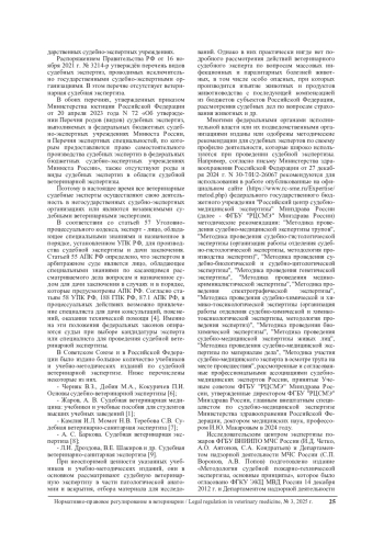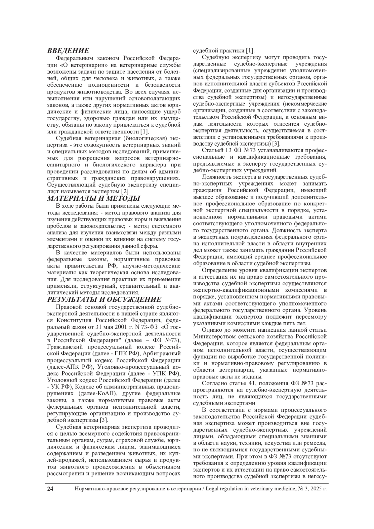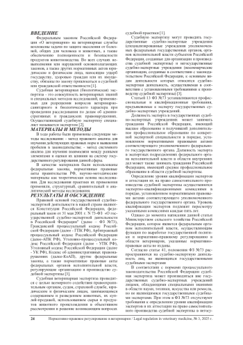 В информационно-правовых базах российского законодательства насчитывается большое количество нормативных актов различного уровня, регламентирующих экспертную деятельность. Задачей судебно-экспертной деятельности является оказание помощи судебным органам и органам дознания при решении задач, требующих специальных познаний. Судебная ветеринарная экспертиза - вид врачебной экспертизы для разрешения специальных вопросов ветеринарной медицины, возникающих в следственной, арбитражной и страховой практике, хозяйственных спорах. Особая потребность в судебно-ветеринарных экспертизах в настоящее время возникла в связи с необходимостью достоверной фиксации событий правонарушения в области ветеринарии, рассмотрении в судах имущественных споров по вопросам компенсации ущерба при изъятии животных и продуктов животноводства при ликвидации особо опасных болезней животных, судебных дел между хозяйствующими субъектами при выявлении болезней при купле-продажи животных, по вопросам страховых выплат, оспаривании владельцами животных действий ветеринарных врачей при лечении мелких домашних животных и др. Качественно проведенная в правовом отношении судебно-ветеринарная экспертиза позволяет судам выносить обоснованные решения. Целью написания статьи являлись анализ законодательства в области судебной ветеринарной медицине и применение нормативно-правовых знаний при работе экспертов.