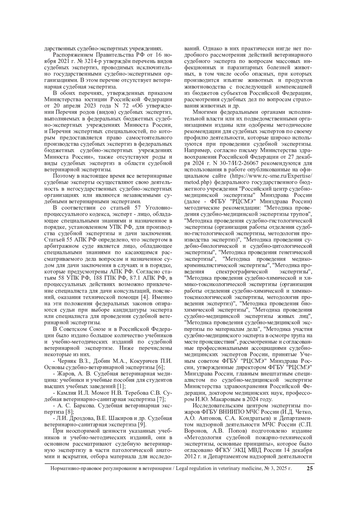 1. Жаров А.В. Судебная ветеринарная медицина: учебник. 3-е изд., испр. и доп. Санкт-Петербург: Лань; 2014: 464 с. ISBN: 978-5-8114-1581-6