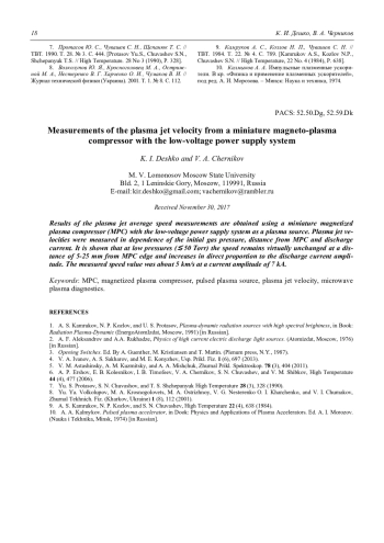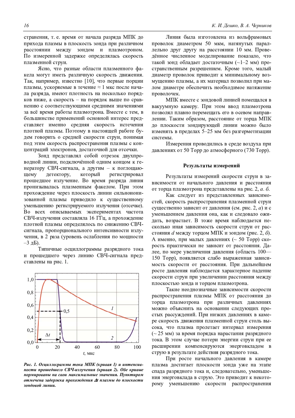 Дешко К. И., Черников В. А. Определение скорости плазменной струи малогабаритного магнитоплазменного компрессора с низковольтной системой питания 15