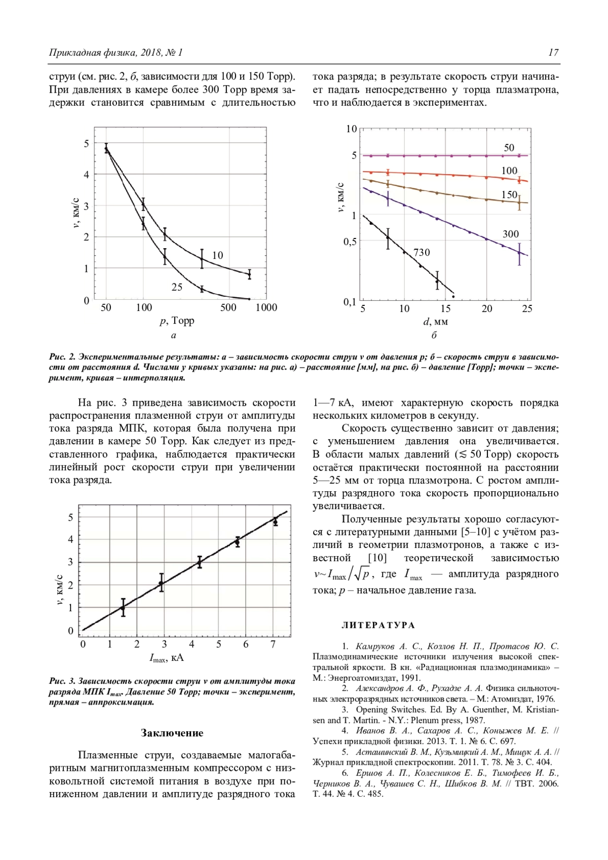 Полученные результаты хорошо согласуются с литературными данными [5–10] с учётом различий в геометрии плазмотронов, а также с известной [10] теоретической зависимостью v~ Imax p, где max I — амплитуда разрядного тока; p – начальное давление газа.