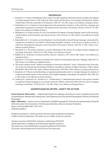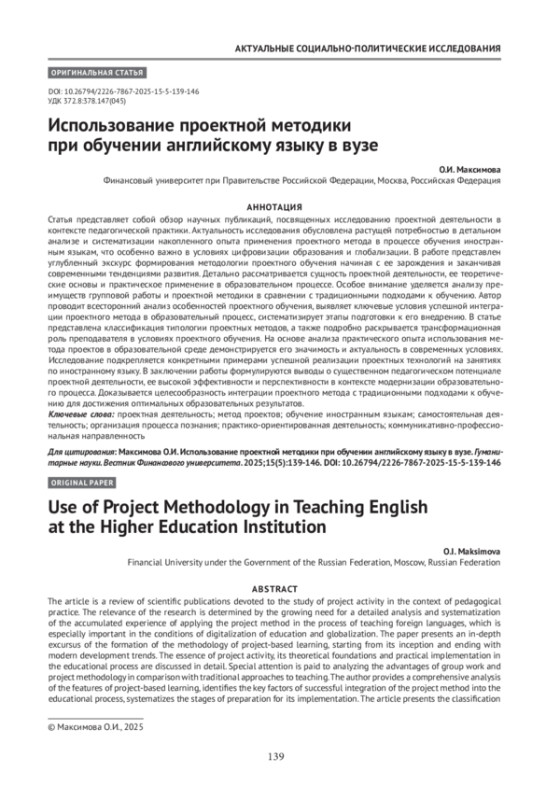 МАКСИМОВА О. И. ИСПОЛЬЗОВАНИЕ ПРОЕКТНОЙ МЕТОДИКИ ПРИ ОБУЧЕНИИ АНГЛИЙСКОМУ ЯЗЫКУ В ВУЗЕ // ГУМАНИТАРНЫЕ НАУКИ. ВЕСТНИК ФИНАНСОВОГО УНИВЕРСИТЕТА. 2025. ТОМ 15, № 5