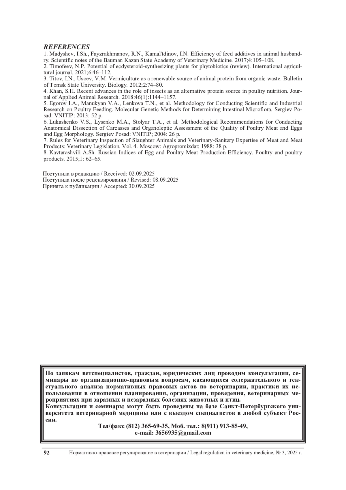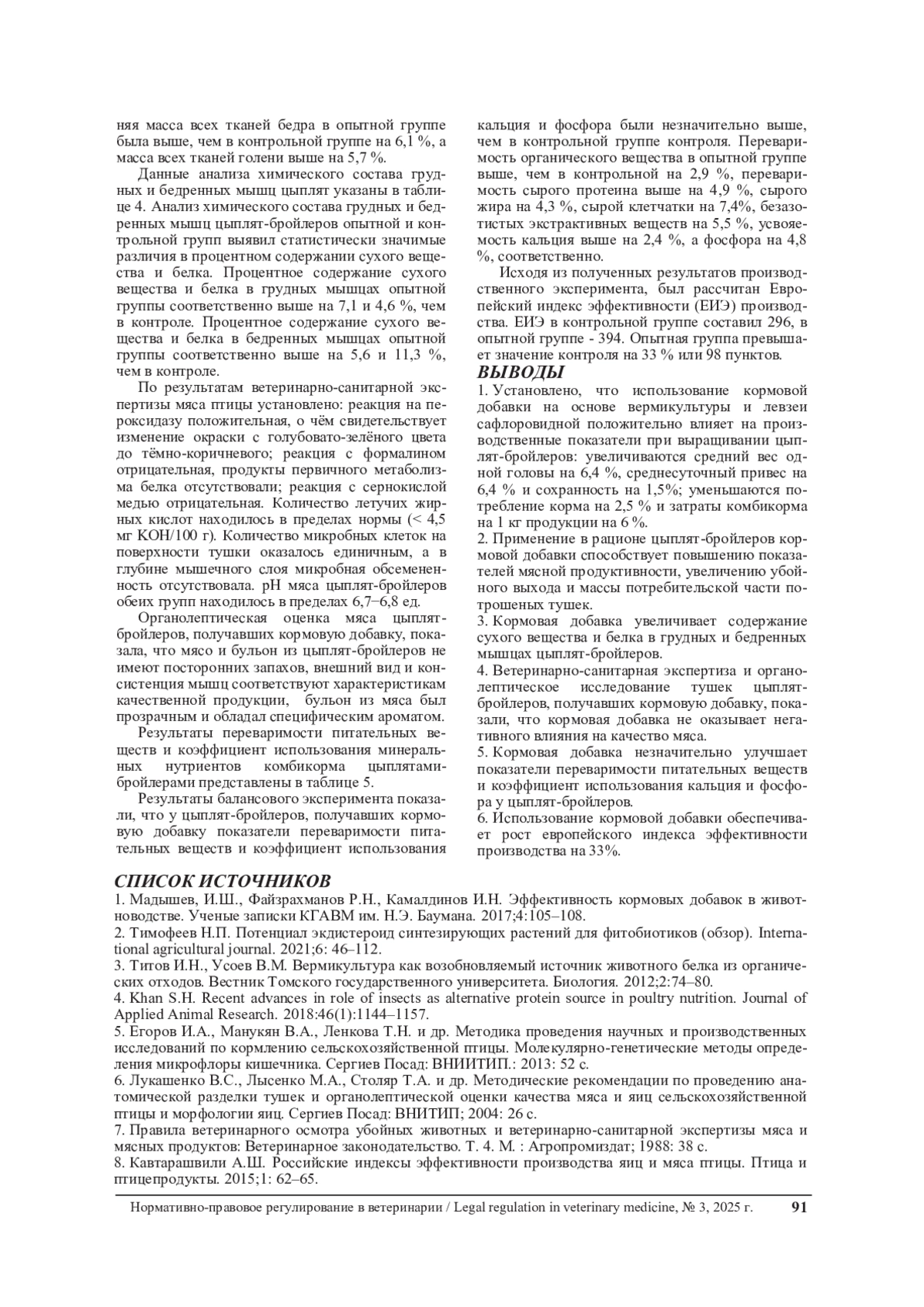 1. Мадышев, И.Ш., Файзрахманов Р.Н., Камалдинов И.Н. Эффективность кормовых добавок в животноводстве. Ученые записки КГАВМ им. Н.Э. Баумана. 2017;4:105-108.