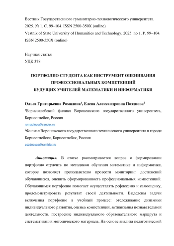 В статье рассматривается вопрос о формировании портфолио студента по методикам обучения математике и информатике, которое позволяет преподавателю провести мониторинг достижений обучающихся, оценить сформированность профессиональных компетенций. Обучающимся портфолио помогает осуществлять рефлексию и самооценку, продемонстрировать результат своей деятельности. Выделены задачи включения портфолио в учебный процесс: отслеживание динамики индивидуального развития, оценка компетенций, активизация познавательной деятельности, построение индивидуального образовательного маршрута и систематизация методического материала. На основе анализа педагогической литературы, требований образовательных стандартов, анкетирования обучающихся определены принципы формирования портфолио: наполнение «от компетенций», добровольности, системности, практико-ориентированности, разноплановости, критериально-ориентированности. Предложена структура портфолио. Основным компонентом портфолио студентов-будущих педагогов математики и информатики является раздел «Портфолио работ». Для его наполнения предложены задания по методикам обучения математике и информатике. Разработаны рекомендации по включению портфолио в учебный процесс. Описан подход к оцениванию портфолио. Приведены примеры критериев для оценки некоторых заданий. Данное исследование представляет как теоретический интерес, связанный с совершенствованием модели оценивания профессиональных компетенций, так и практическую значимость, так как может быть использовано в деятельности преподавателей и разработчиков образовательных программ.