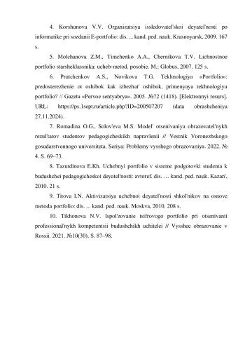 4. Коршунова В.В. Организация исследовательской деятельности по информатике при создании Е-портфолио: дис.. канд. пед. наук. Красноярск, 2009. 167 с. EDN: ZDMVNJ