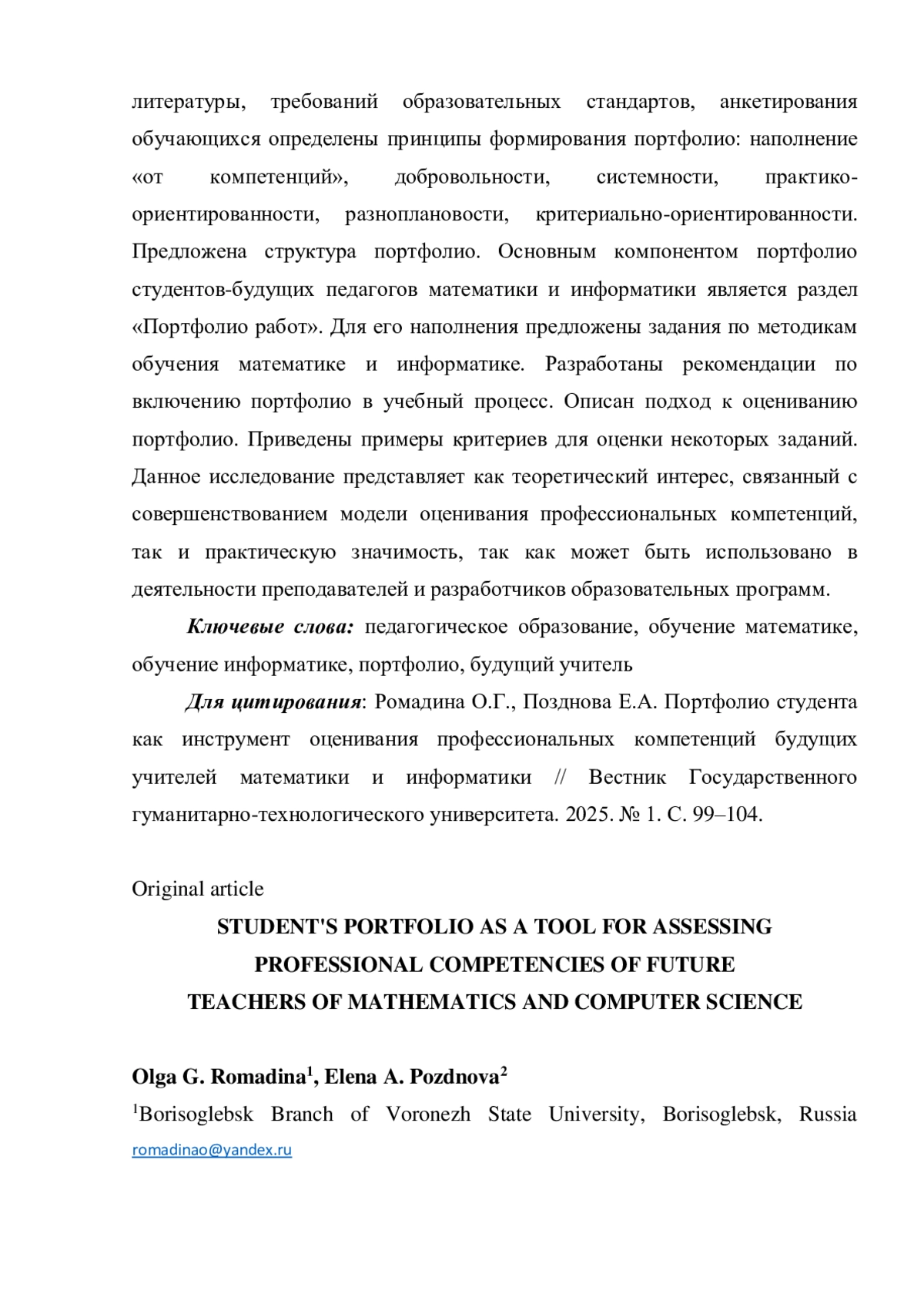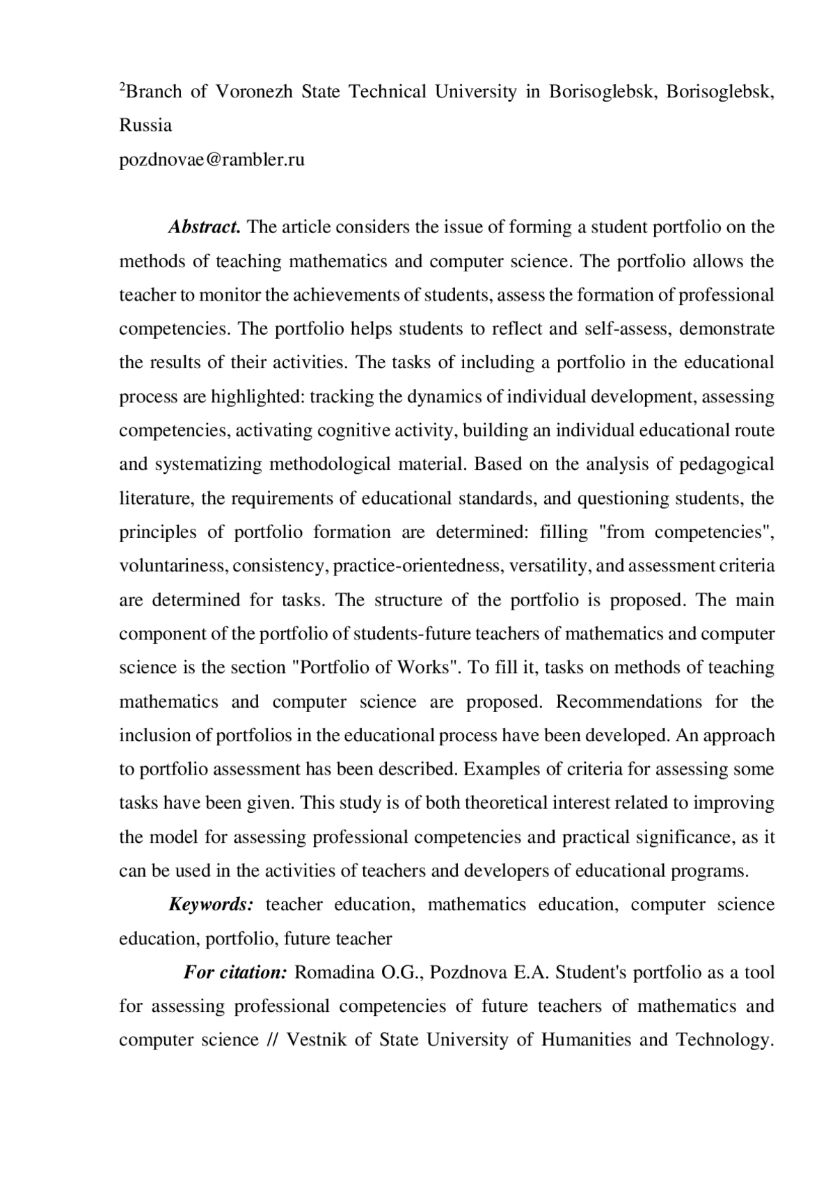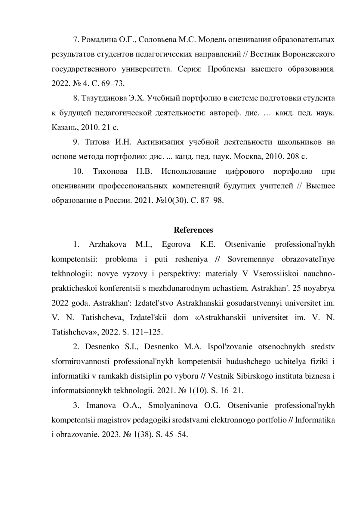10. Тихонова Н.В. Использование цифрового портфолио при оценивании профессиональных компетенций будущих учителей // Высшее образование в России. 2021. №10(30). С. 87-98. EDN: VFMNPY