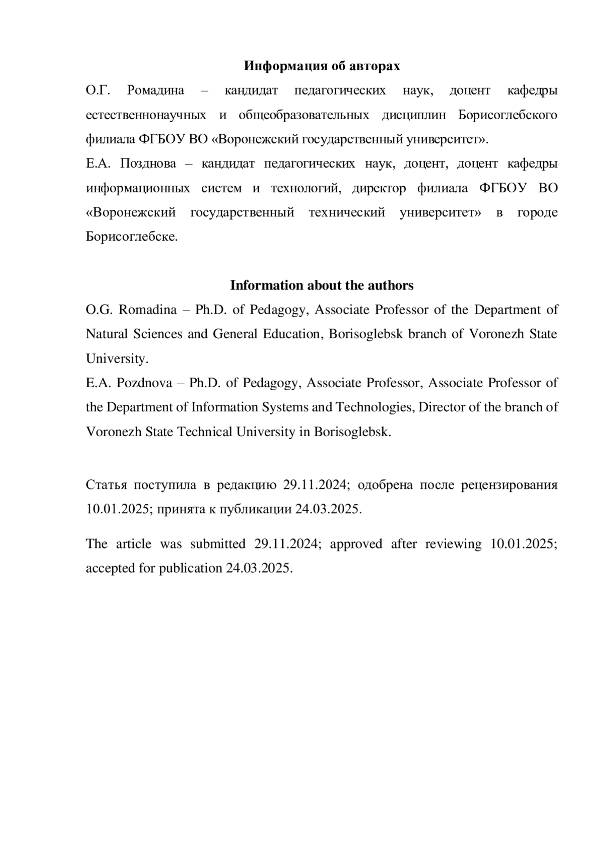 7. Ромадина О.Г., Соловьева М.С. Модель оценивания образовательных результатов студентов педагогических направлений // Вестник Воронежского государственного университета. Серия: Проблемы высшего образования. 2022. № 4. С. 69-73. EDN: EBRGQE
