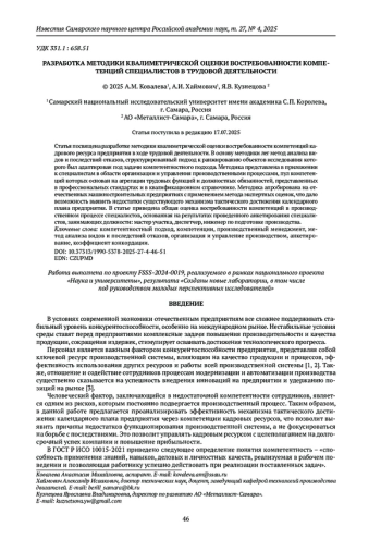 3. Андрончев И. К. Методика исследования метакомпетенций сотрудников при модернизации производства / И. К. Андрончев, А. Я. Дмитриев, А. М. Ковалева // Компетентность. - 2025. - № 4. - С. 38-42. EDN: KTCRHK