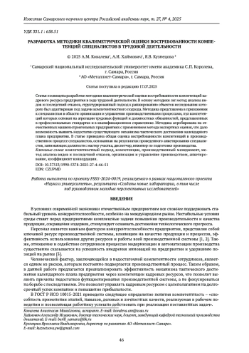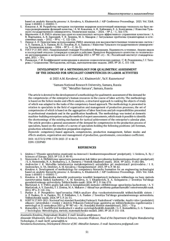 4. Kovaleva A. Development of methodology for competency hierarchy formation for an engineering technologist based on analytic hierarchy process/ A. Kovaleva, A. Khaimovich // AIP Conference Proceedings. 2025. Vol. 3268. Issue 1:050031-1-050031-7.
