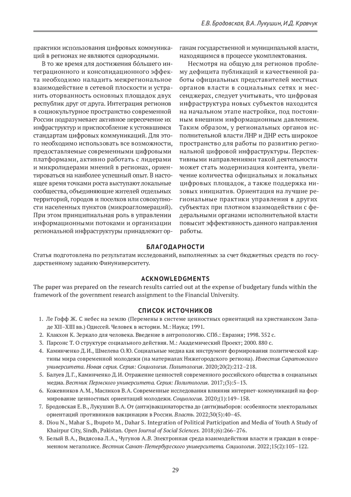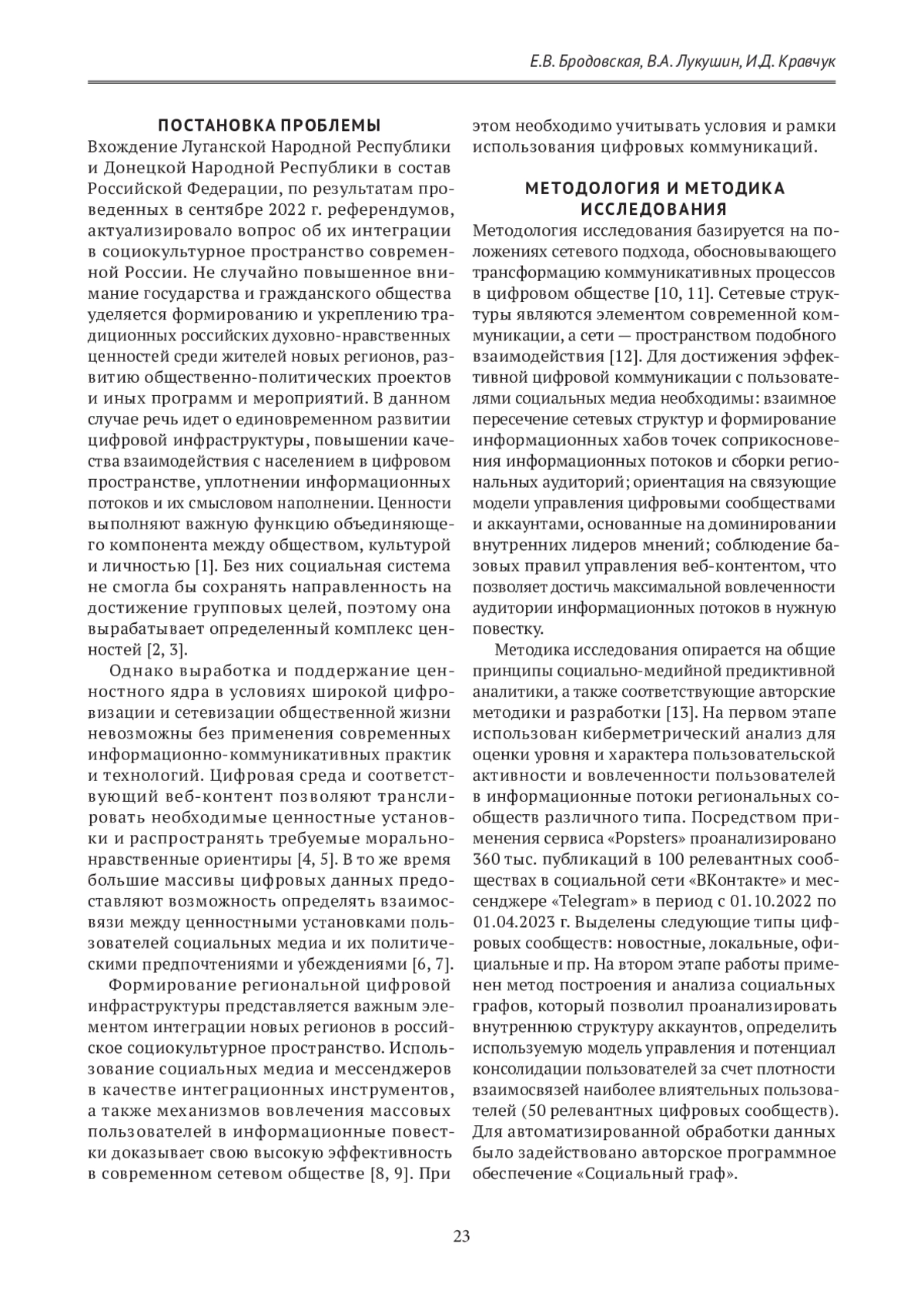 БРОДОВСКАЯ Е. В., ЛУКУШИН В. А., КРАВЧУК И. Д. ОЦЕНКА ЭФФЕКТИВНОСТИ ТЕХНОЛОГИЙ ЦИФРОВЫХ КОММУНИКАЦИЙ ДЛЯ ИНТЕГРАЦИИ ЖИТЕЛЕЙ ЛНР И ДНР В СОЦИОКУЛЬТУРНОЕ ПРОСТРАНСТВО РОССИИ // ГУМАНИТАРНЫЕ НАУКИ. ВЕСТНИК ФИНАНСОВОГО УНИВЕРСИТЕТА. 2024. ТОМ 14, № 1