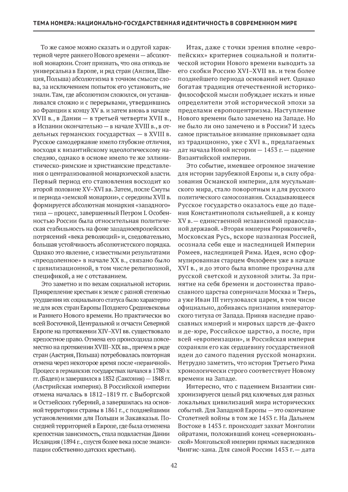 В статье рассматривается история и сущность понятия «Новое время». Отмечается, что логично сохранять первоначальный смысл этого термина, сложившегося в Западной Европе в эпоху Ренессанса и обозначавшего период начиная с XV в. В то же время обращается внимание на ущербность подхода, сдвигающего границы Нового времени на более поздние сроки в истории других государств и приравнивающего данный рубеж к вестернизации. При этом игнорируется как цивилизационная специфика, так и глобальный характер исторических изменений, наступивших в XV в. Также автор отмечает, что в русской философско-богословской мысли мировое «Новое время» хронологически совпадает с историей Третьего Рима — России как православной «мировой империи», преемницы средневековой Византии.