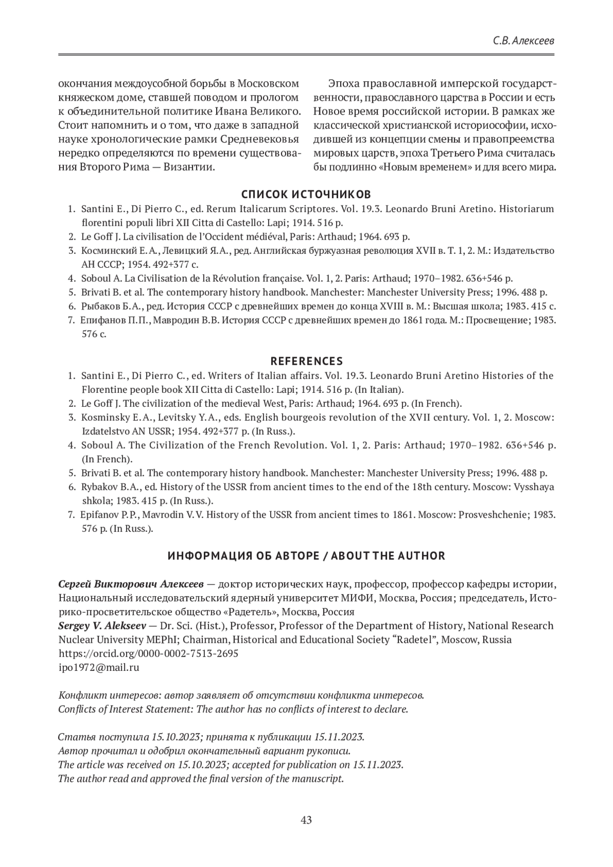 АЛЕКСЕЕВ С. В. НОВОЕ ВРЕМЯ И ТРЕТИЙ РИМ: О СЛОЖНОСТЯХ ПЕРИОДИЗАЦИИ ИСТОРИИ // ГУМАНИТАРНЫЕ НАУКИ. ВЕСТНИК ФИНАНСОВОГО УНИВЕРСИТЕТА. 2024. ТОМ 14, № 1