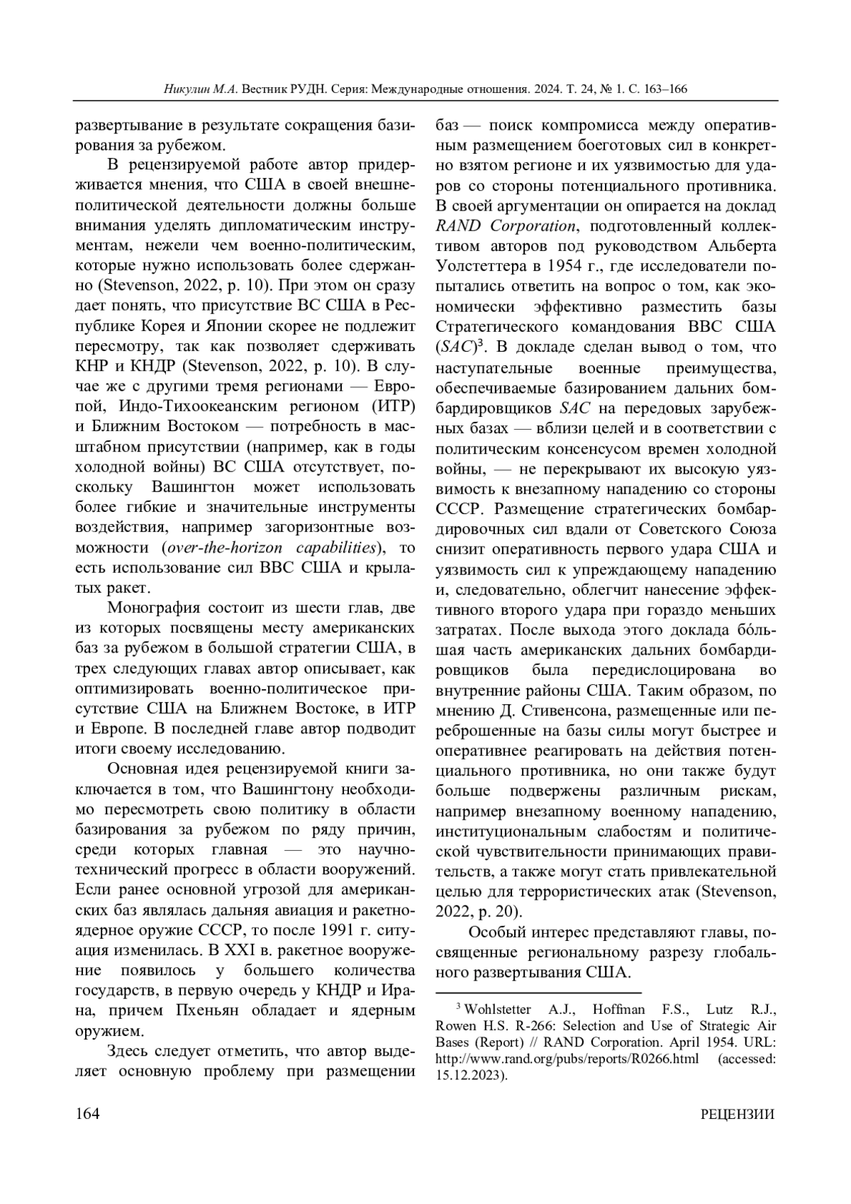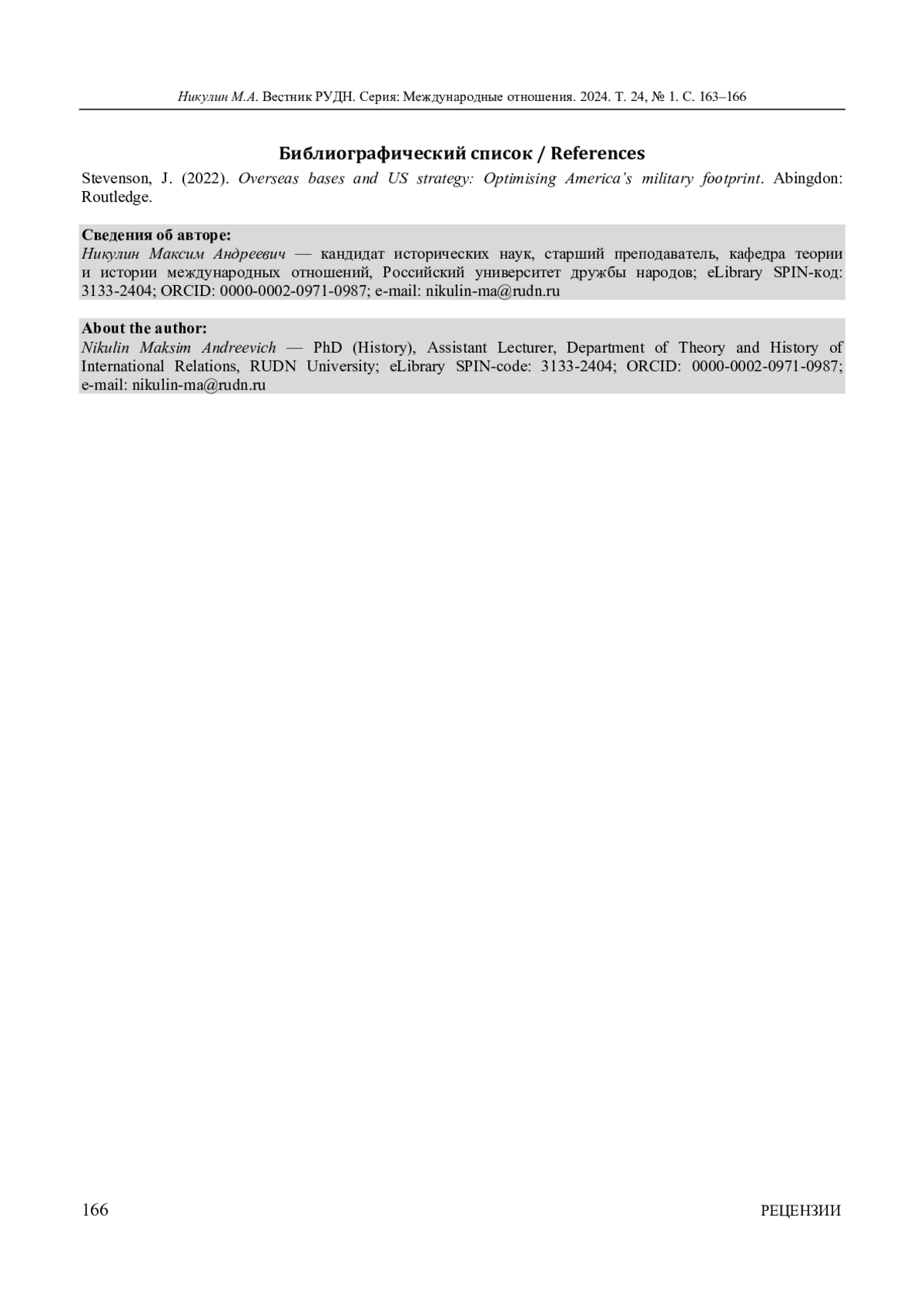 Для цитирования: Никулин М. А. Рецензия на книгу: Stevenson J. Overseas Bases and US Strategy: Optimising America’s Military Footprint. Abingdon: Routledge, 2022. 140 p. // Вестник Российского университета дружбы народов. Серия: Международные отношения. 2024. Т. 24, № 1. С. 163–166. https://doi. org/10.22363/2313-0660-2024-24-1-163-166