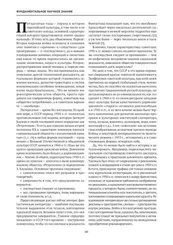 В 1950-е гг. в СССР социокультурные основания функционирования общественных практик и институтов были противоположны таковым в последующие периоды истории СССР и современной России. Кроме того, они противоположны ныне доминирующим тенденциям мирового развития, описанным в работе Зигмунта Баумана «Ретротопия». В культуре того времени слабо выражена массовая ностальгия как поиск «эмоциональной общности с коллективной памятью». Основной определяющий признак 1950-х гг. — рациональность. С этой точки зрения автором рассматриваются нарративы, направленные на коррекцию дискурса «советского», дискредитированного во время Второй мировой войны и политических изменений в советском обществе в конце 1940-х — начале 1950-х гг. Выделяются два типа нарратива — нарратив убеждения и нарратив предвидения, которые транслировались коммерческой рекламой и научно-фантастической литературой. Нарратив предвидения, характерный для культуры 1950-х гг., остался для нее специфическим и дальнейшего развития не получил.