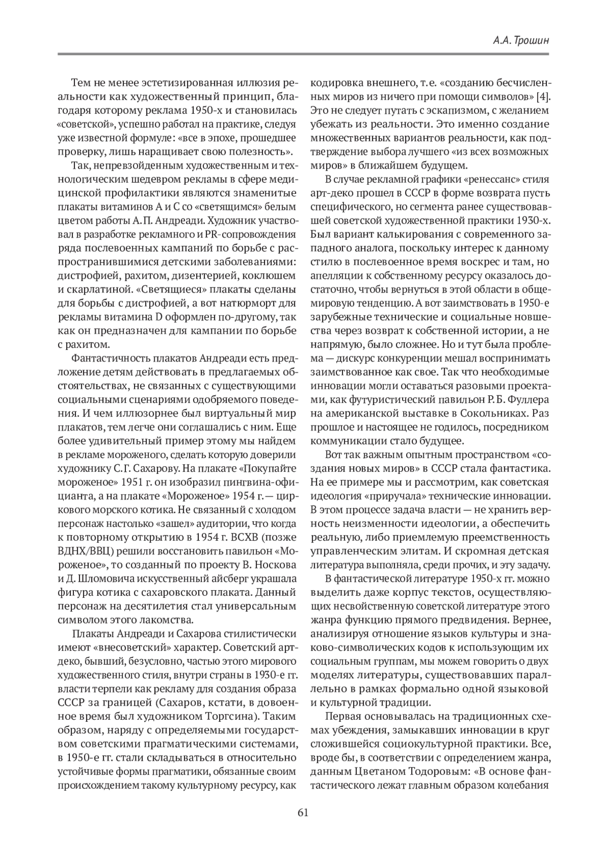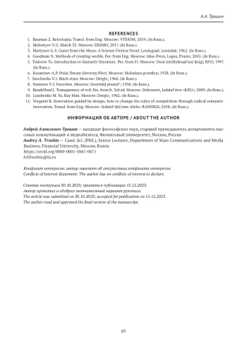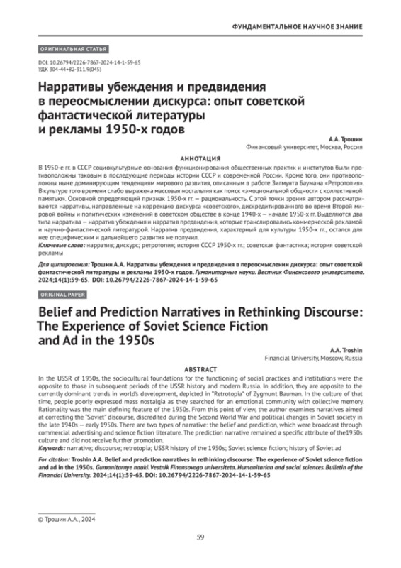 ТРОШИН А. А. НАРРАТИВЫ УБЕЖДЕНИЯ И ПРЕДВИДЕНИЯ В ПЕРЕОСМЫСЛЕНИИ ДИСКУРСА: ОПЫТ СОВЕТСКОЙ ФАНТАСТИЧЕСКОЙ ЛИТЕРАТУРЫ И РЕКЛАМЫ 1950-Х ГОДОВ // ГУМАНИТАРНЫЕ НАУКИ. ВЕСТНИК ФИНАНСОВОГО УНИВЕРСИТЕТА. 2024. ТОМ 14, № 1