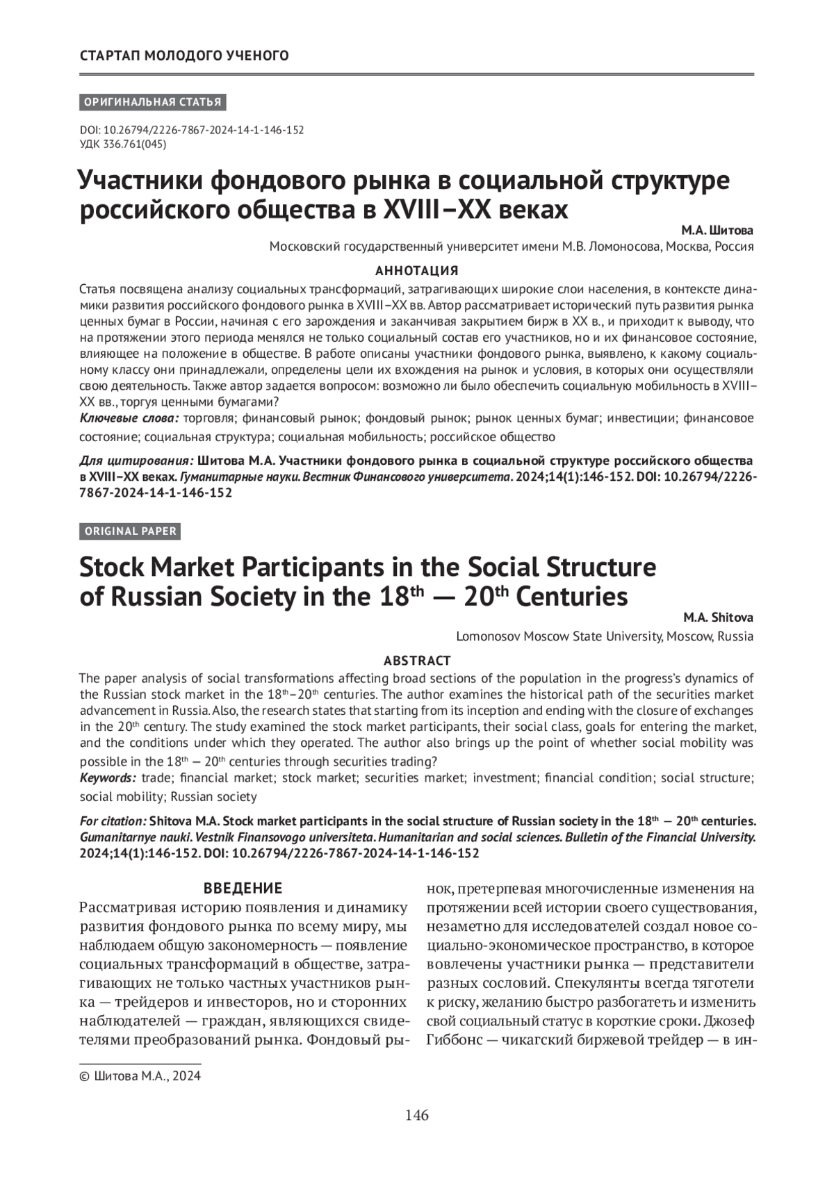 Статья посвящена анализу социальных трансформаций, затрагивающих широкие слои населения, в контексте динамики развития российского фондового рынка в XVIII–XX вв. Автор рассматривает исторический путь развития рынка ценных бумаг в России, начиная с его зарождения и заканчивая закрытием бирж в XX в., и приходит к выводу, что на протяжении этого периода менялся не только социальный состав его участников, но и их финансовое состояние, влияющее на положение в обществе. В работе описаны участники фондового рынка, выявлено, к какому социальному классу они принадлежали, определены цели их вхождения на рынок и условия, в которых они осуществляли свою деятельность. Также автор задается вопросом: возможно ли было обеспечить социальную мобильность в XVIII– XX вв., торгуя ценными бумагами?