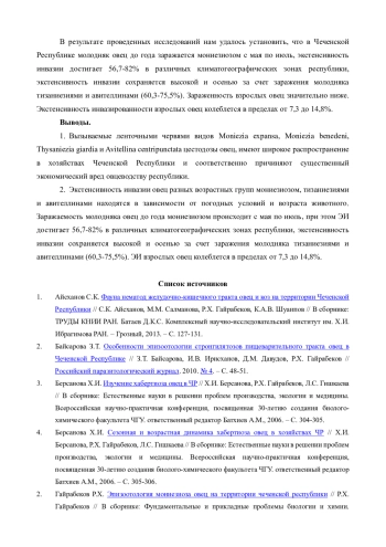 5. Гайрабеков Р.Х. Эпизоотология мониезиоза овец на территории чеченской республики // Р.Х. Гайрабеков // В сборнике: Фундаментальные и прикладные проблемы биологии и химии. Материалы ежегодной Всероссийской научно-практической конференции, посвященной 60-летию кафедры ботаники, зоологии и биоэкологии. - Грозный, 2023. - С. 70-72. EDN: RVBKDW