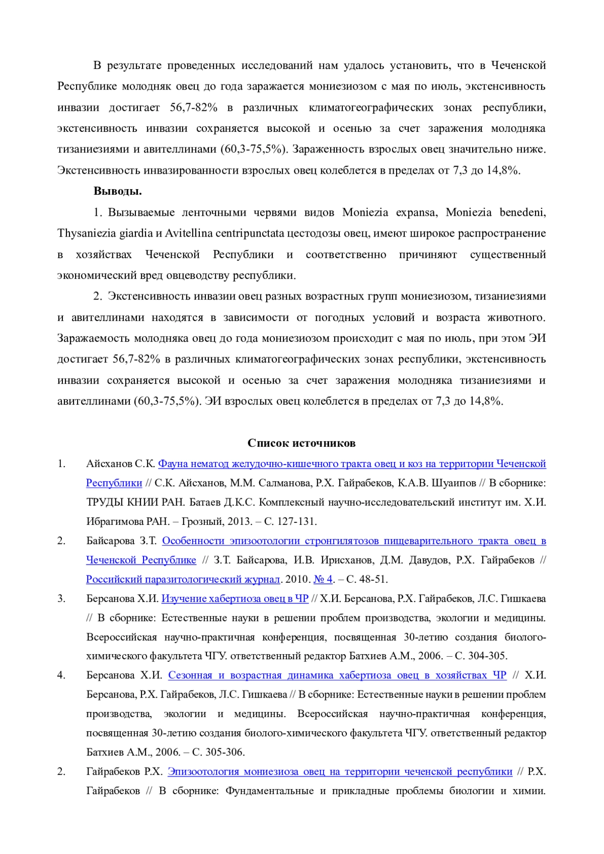 7. Гайрабеков Р.Х. Эпизоотология мониезиоза овец на территории Чеченской Республики //Р.Х. Гайрабеков// В сборнике: Фундаментальные и прикладные проблемы биологии и химии. Материалы ежегодной Всероссийской научно-практической конференции, посвященной 60-летию кафедры ботаники, зоологии и биоэкологии. - Грозный, 2023. - С. 70-72. EDN: RVBKDW